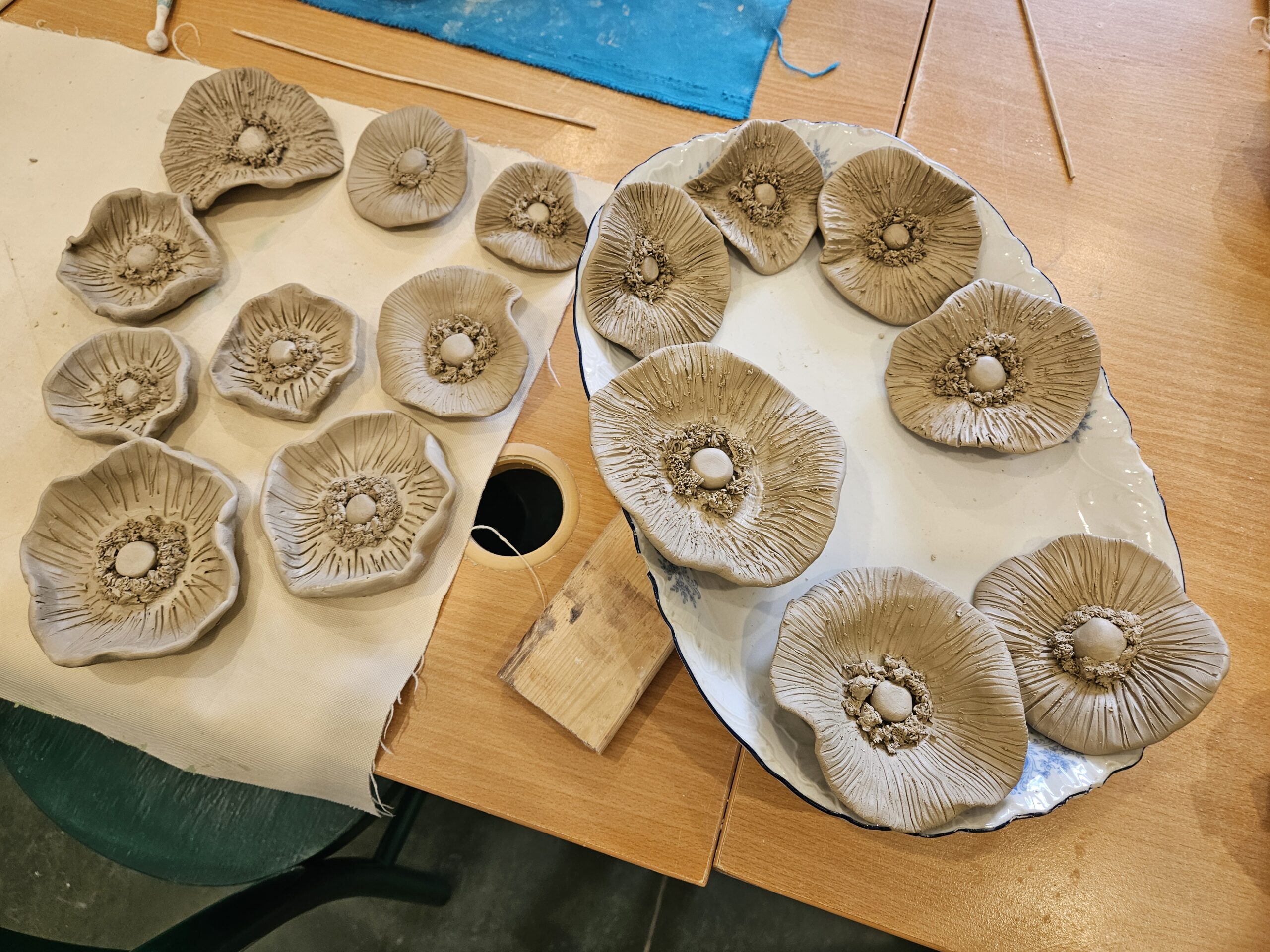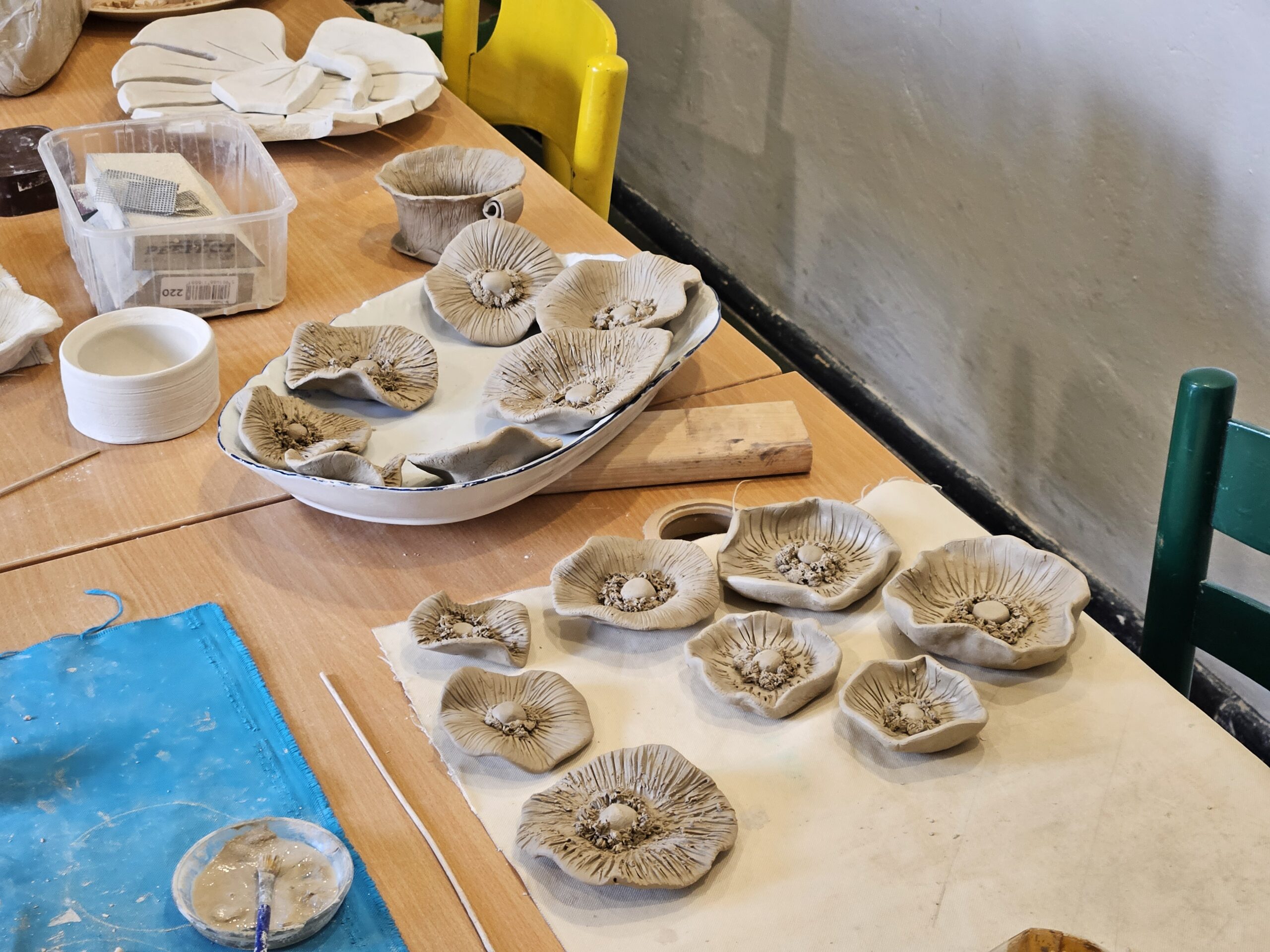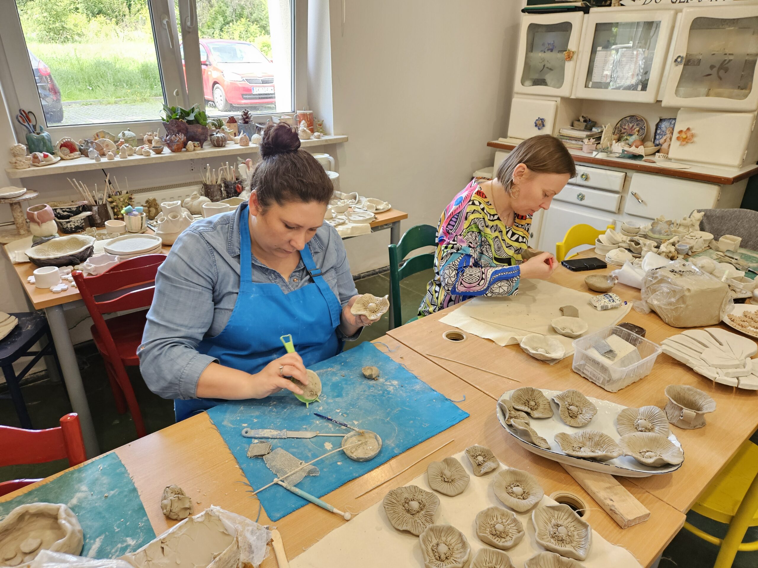 Czy to są liście, kwiaty, obojętnie – robimy też dla siebie i jak coś potrzeba. Jedna, druga podpowiada i się dopełniamy. Cierpliwość nas wycisza, działamy razem… i spieramy się też trochę – opowiada Katarzyna Chachuła, jedna z uczestniczek pracowni.