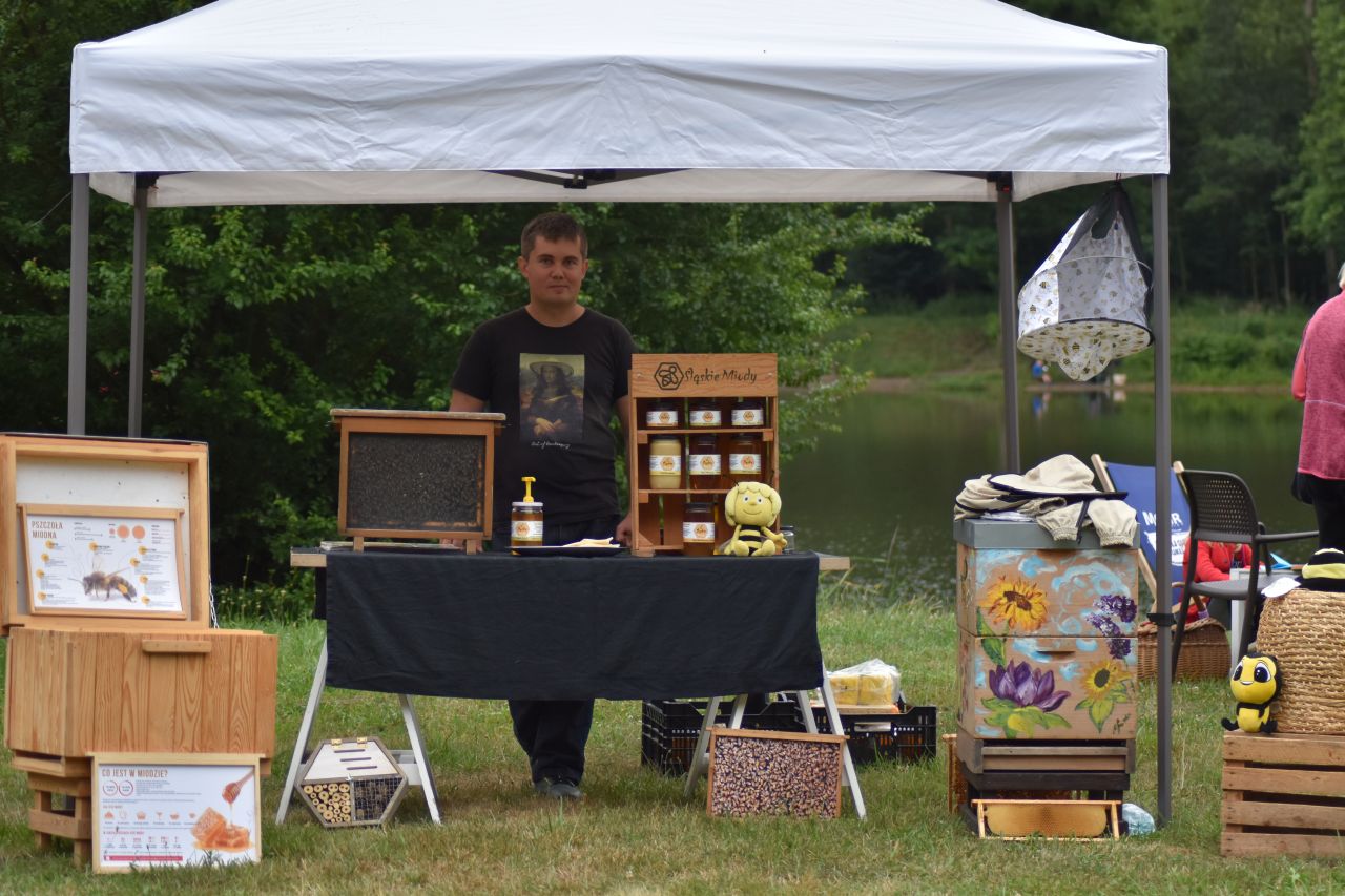 – Przy okazji wszyskich imprez miejskich staramy się odwiedzać z naszymi pszczółkami, więc w szklanym ulu mamy żywe pszczoły, można podejrzeć. Nawet królowa osobiście z nami jeździ. No i mamy również nasze mysłowickie miody, którymi częstujemy – mówi Krzysztof Poppe z pasieki Śląskie Miody.