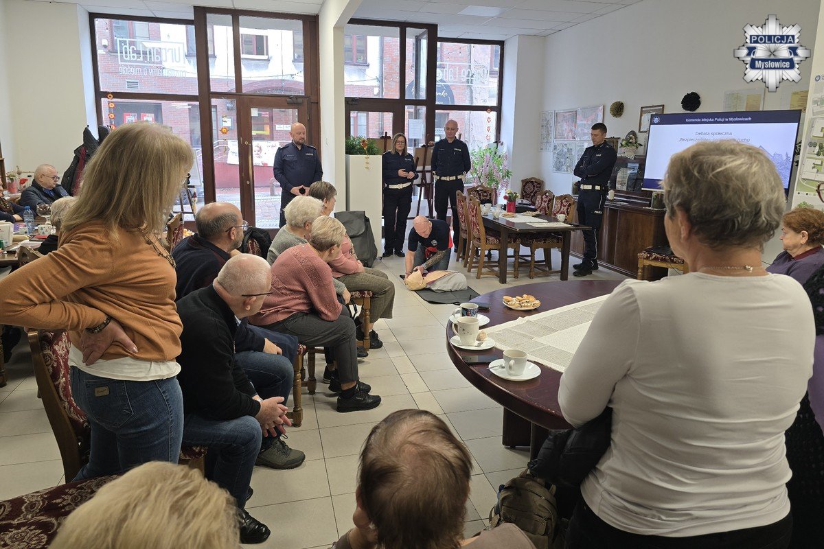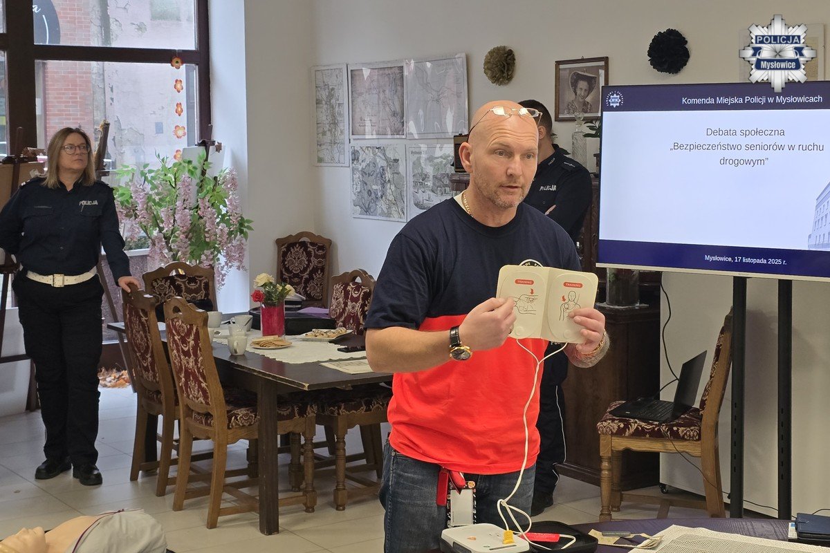 Ważnym elementem spotkania była część poświęcona pierwszej pomocy. Ratownik z Wojewódzkiego Pogotowia Ratunkowego w Katowicach omówił podstawy udzielania pomocy dorosłym i dzieciom, a seniorzy mogli przećwiczyć RKO na manekinach oraz poznać działanie AED.