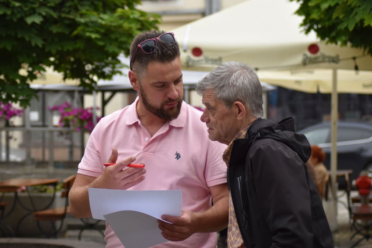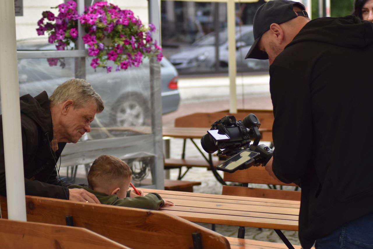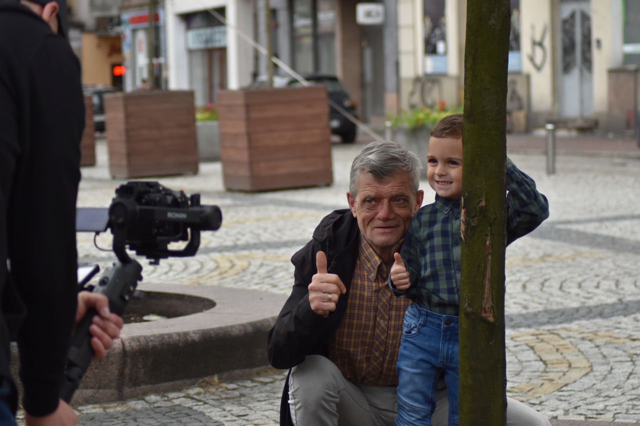 Maciej Jabłoński pochodzi z Mysłowic. Przez lata grał ze swoim zespołem na weselach, potem przeprowadził się do Anglii. Niebawem wraca do naszego miasta na stałe i znów chce zająć się muzyką. Pierwszym krokiem w tym kierunku jest nagranie własnej piosenki i teledysku. I to właśnie klip do utworu „Daj mi buziaka” powstawał dziś na rynku, a wczoraj także w Caffe Artnova. Do udziału w przedsięwzięciu Maciek zaprosił Henryka Gołębiewskiego, znanego m.in. z filmów „Podróż za jeden uśmiech”, „Stawiam na Tolka Banana” czy „Edi”. Obecność pana Henryka na mysłowickim rynku poruszyła mieszkańców, którzy chętnie robili sobie pamiątkowe zdjęcia z aktorem.
