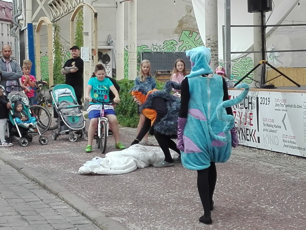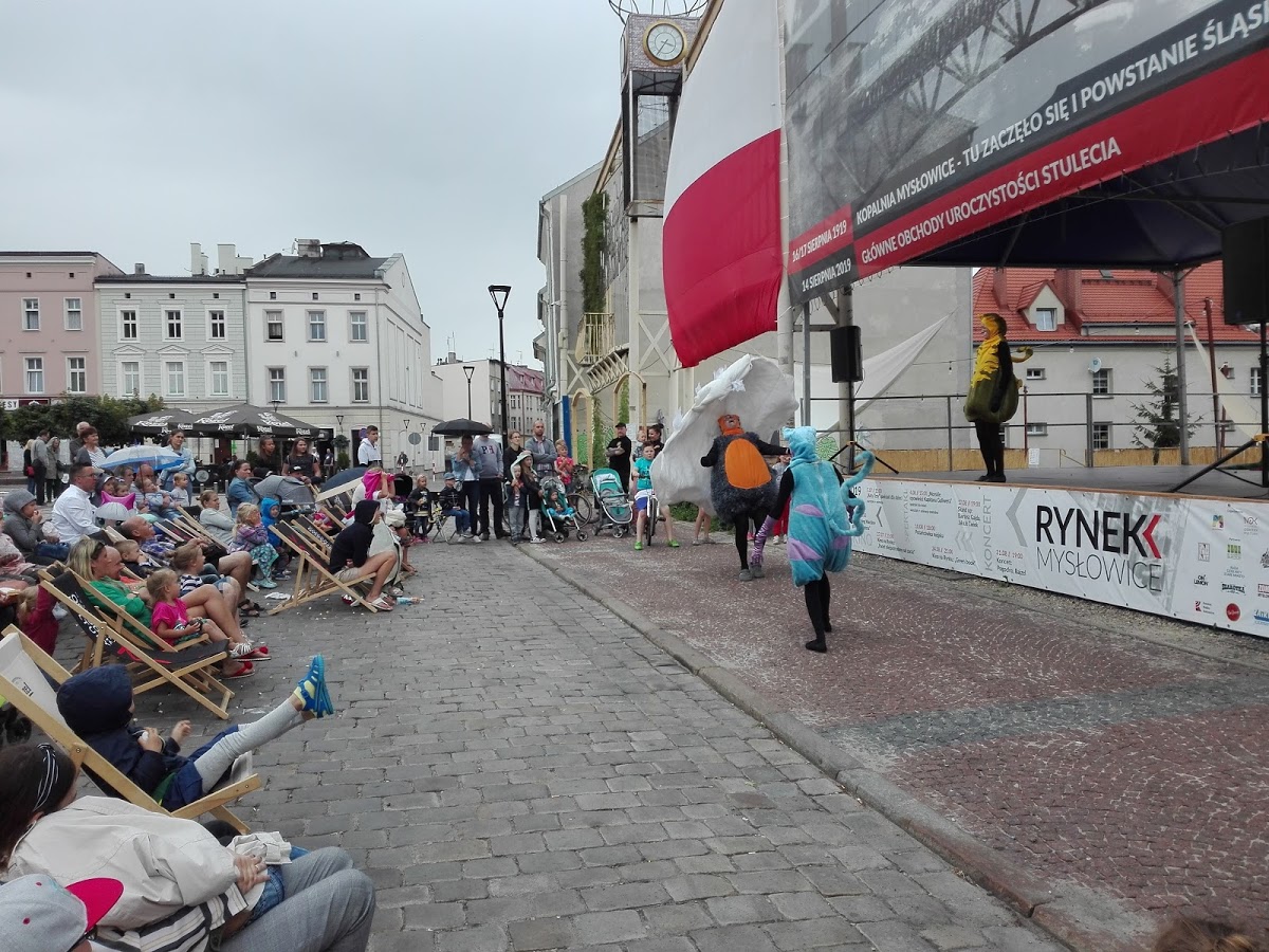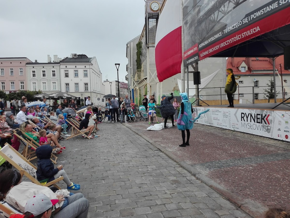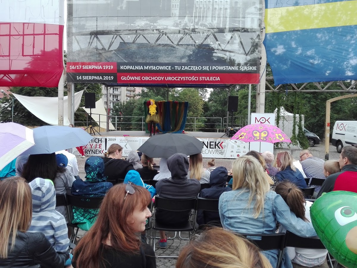 Co prawda pogoda w niedzielę nie rozpieszczała przybyłych na mysłowicki rynek, ale nie zraziło to publiczności, która schowała się pod parasolami. Aktorzy zaprosili dzieci na zadaszoną scenę, gdzie po spektaklu miały miejsce także animacje ze slime’ami. Z kolei teatr Epidemia przygotował dla najmłodszych warsztaty robienia wielkich baniek mydlanych.