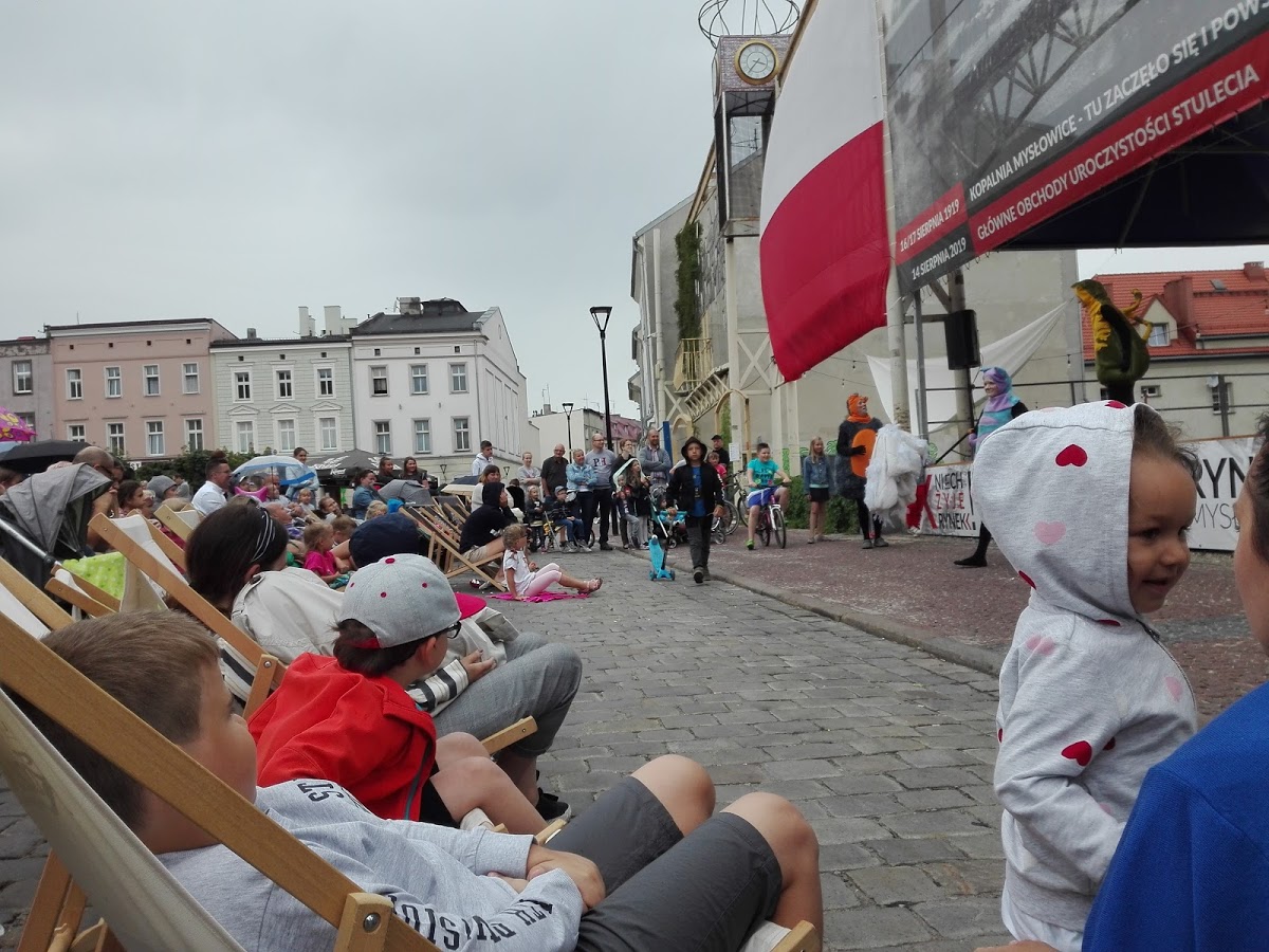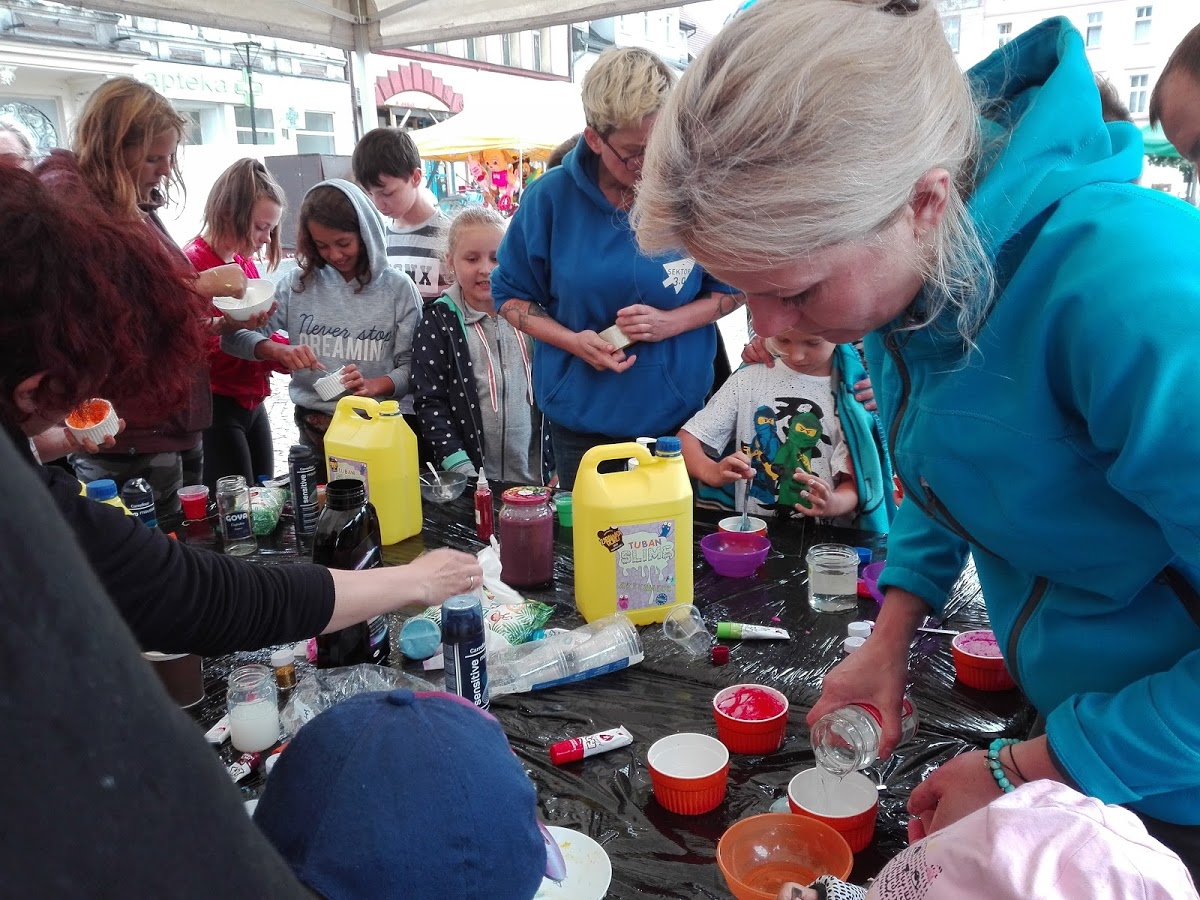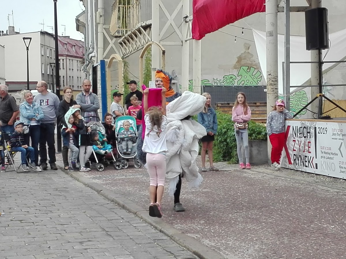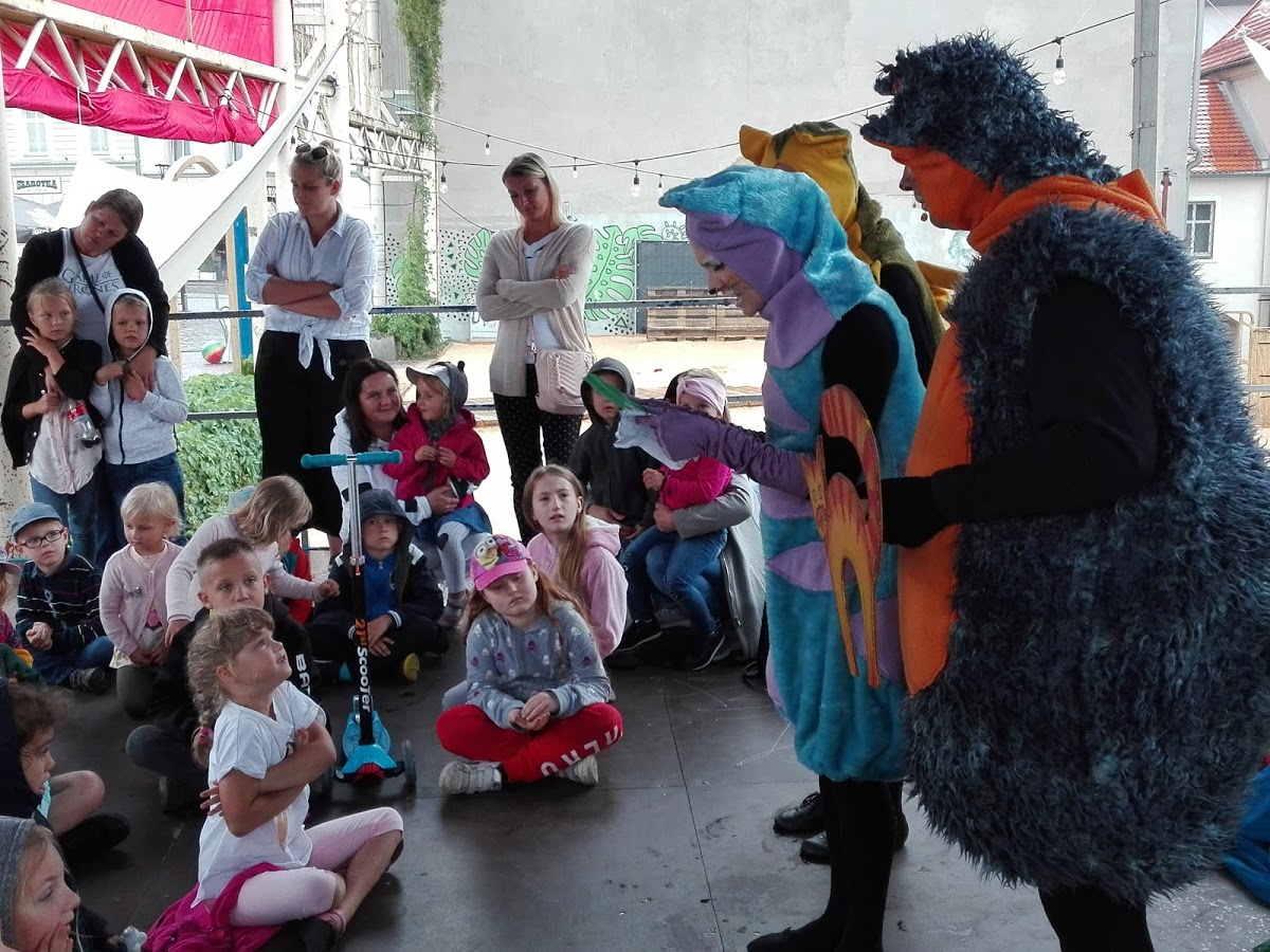 Co prawda pogoda w niedzielę nie rozpieszczała przybyłych na mysłowicki rynek, ale nie zraziło to publiczności, która schowała się pod parasolami. Aktorzy zaprosili dzieci na zadaszoną scenę, gdzie po spektaklu miały miejsce także animacje ze slime’ami. Z kolei teatr Epidemia przygotował dla najmłodszych warsztaty robienia wielkich baniek mydlanych.
