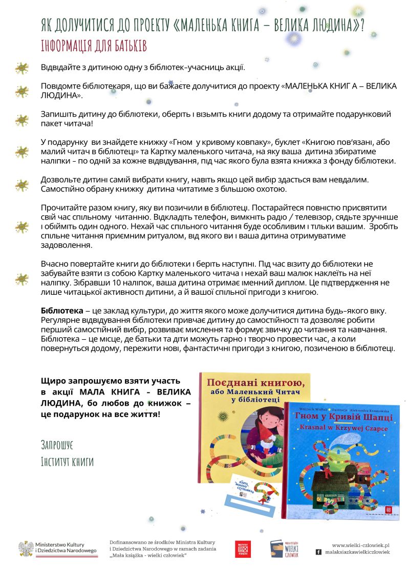 Udział w projekcie jest całkowicie bezpłatny. Kampania realizowana jest przez Instytut Książki ze środków Ministerstwa Kultury i Dziedzictwa Narodowego.