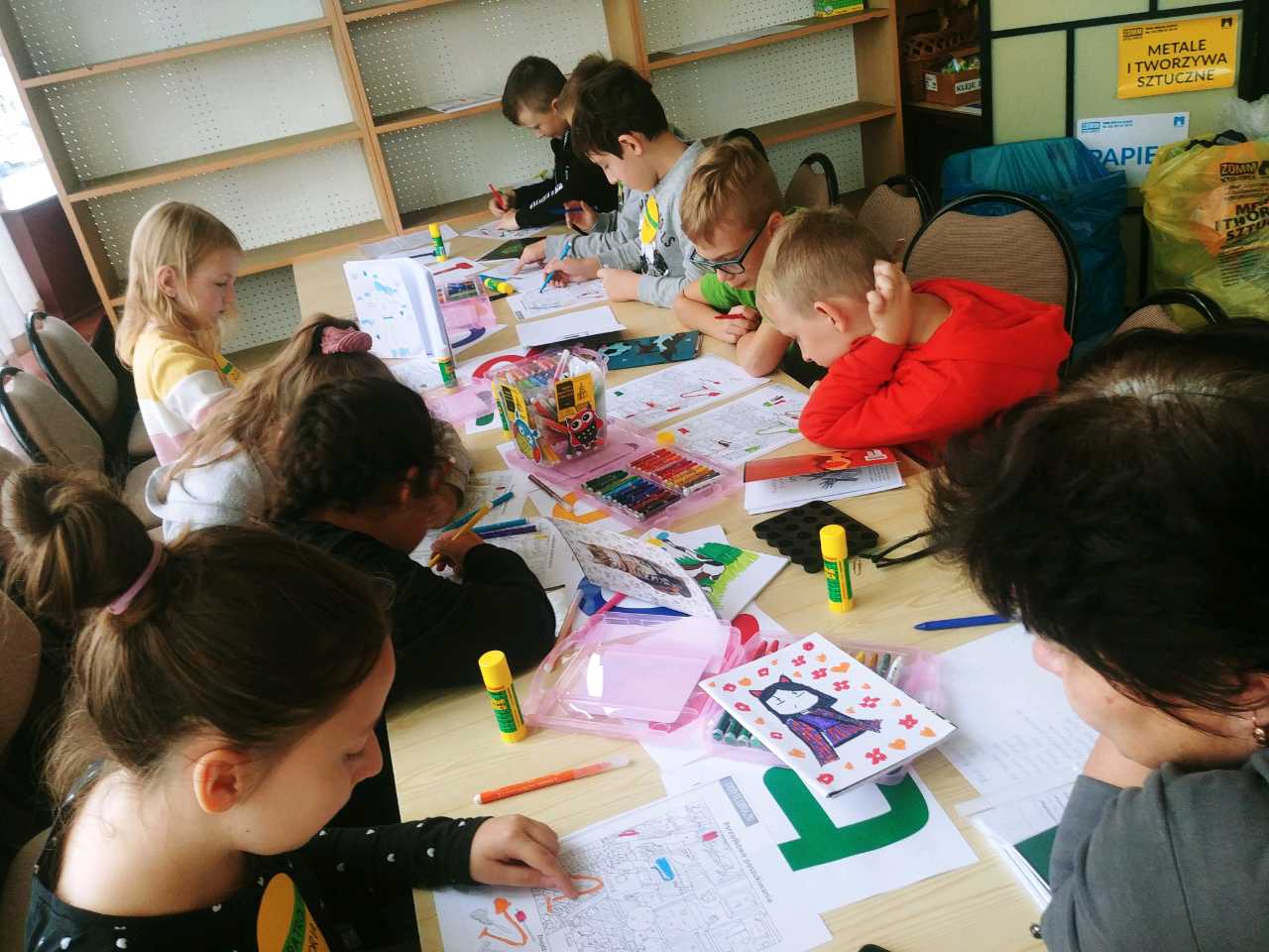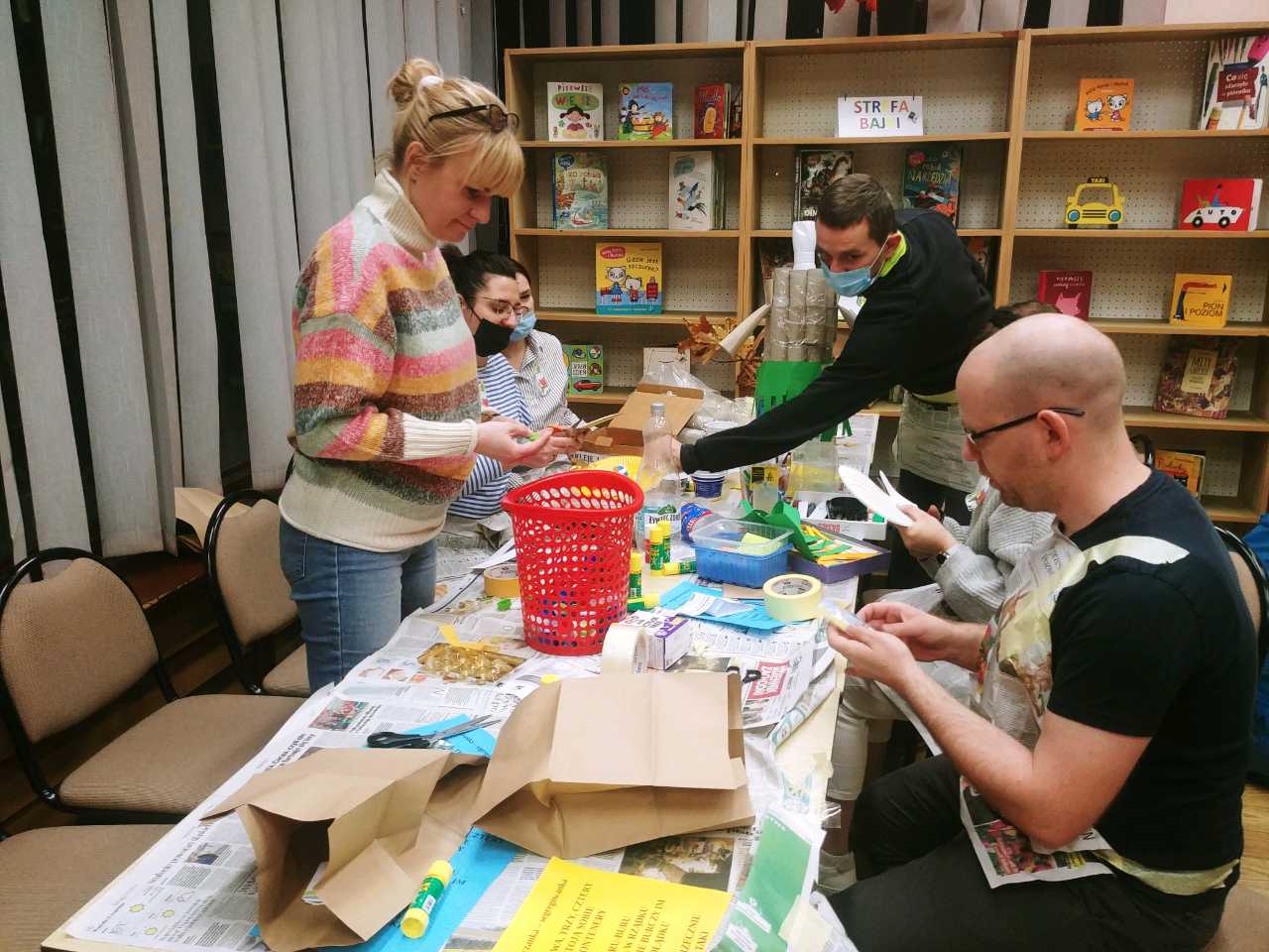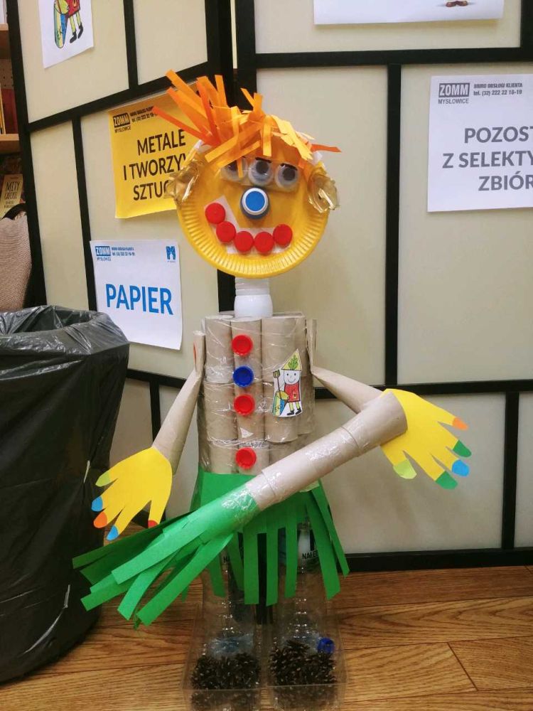 Najbardziej emocjonującą częścią zabawy było wspólne wykonanie ekoludka z posegregowanych odpadów, znajdujących się w worku żółtym i niebieskim. W efekcie z rzeczy z tworzywa sztucznego i papieru powstał duży ekoludek, któremu nadano imię Felicja. Spotkanie w bibliotece zakończyło się wspólnym tańcem i wręczeniem dzieciom upominków w papierowych torebkach.