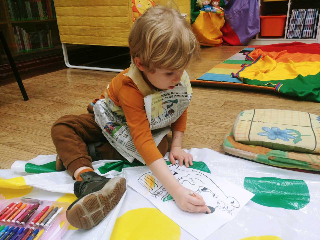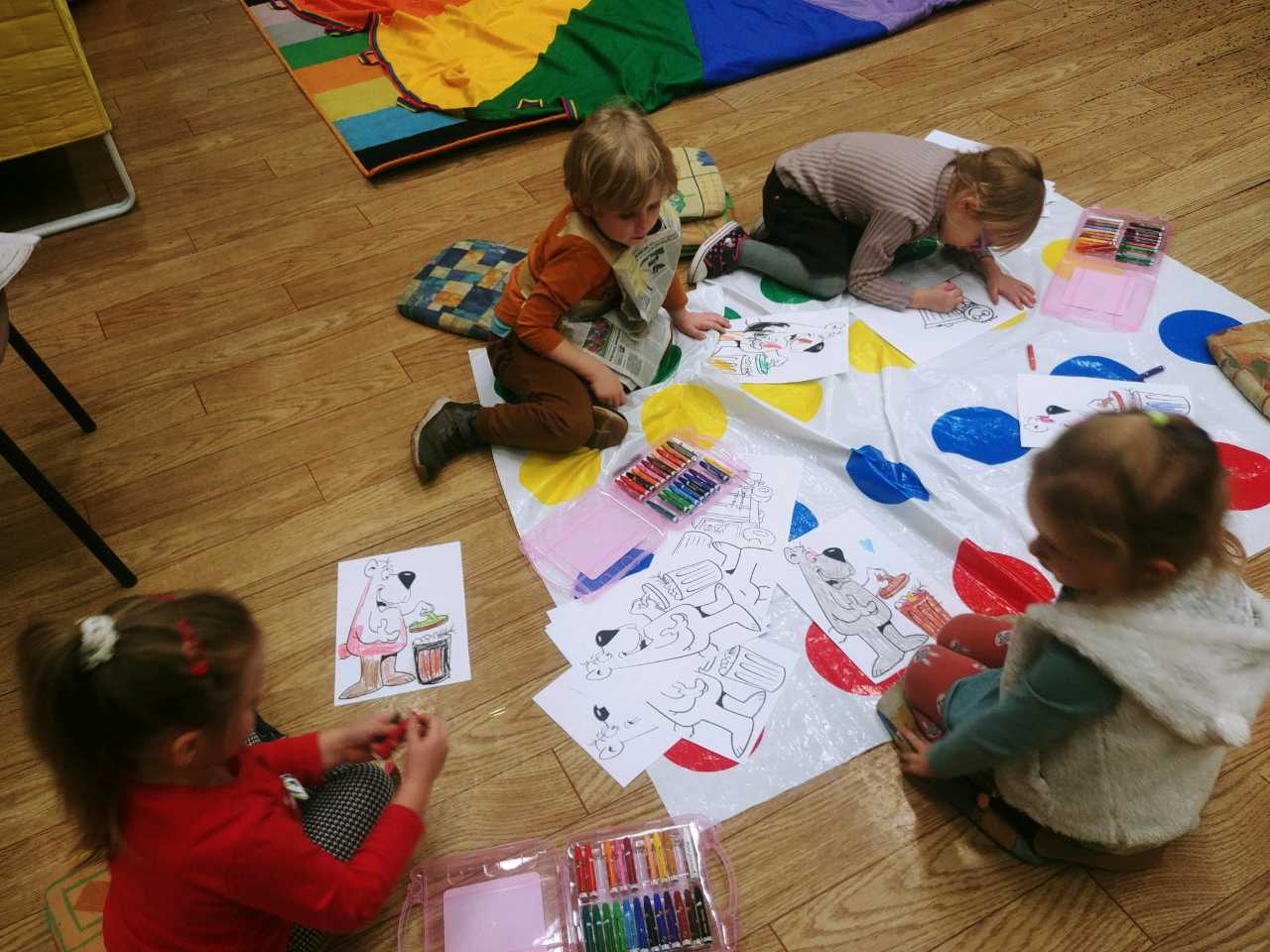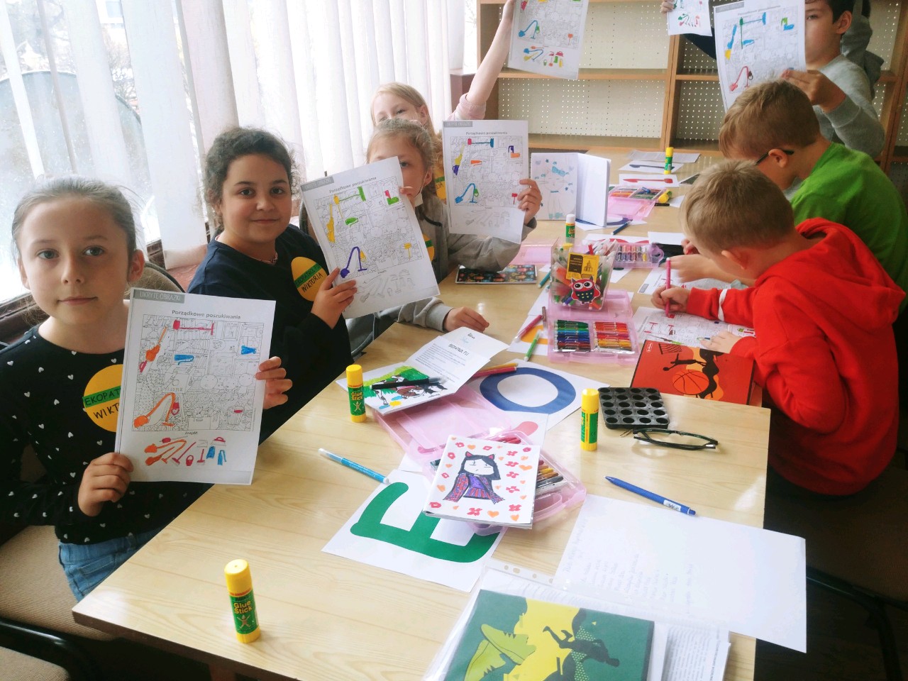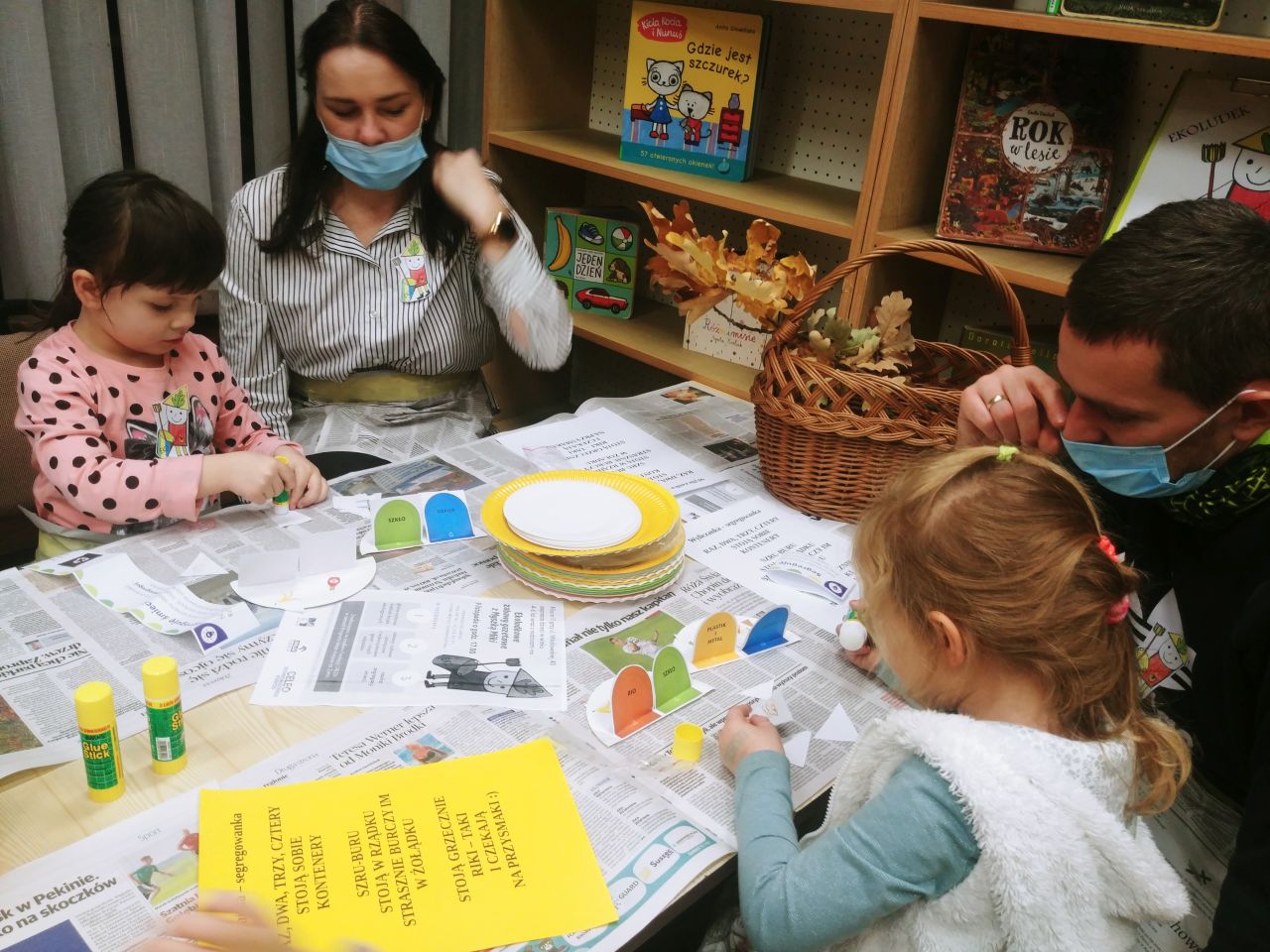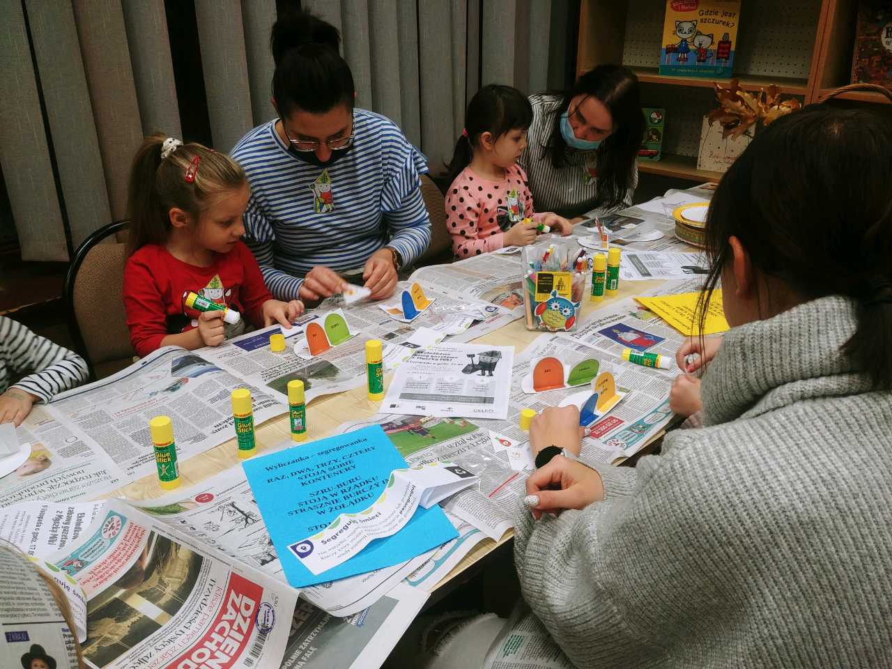 Natomiast dla małych dzieci i ich rodziców zorganizowano w filii nr 11 zabawę ekologiczną pod hasłem „Ekoludkowe zabawy gazetowe z Myszką Miki”. Pośród prowadzonych zabaw integracyjnych dla najmłodszych i głośnego czytania wierszy oraz wyliczanek ekologicznych, wykonano ochronne fartuchy z gazet i taśmy malarskiej, w których dzieci i rodzice segregowali rozsypane śmieci: plastikowe butelki, kubki, kartoniki po sokach i mleku, woreczki i reklamówki foliowe, butelki szklane, słoiki, nakrętki, opakowania po słodyczach, makaronie i inne odpady. Wszystkie śmieci szybko trafiły do oznaczonych odpowiednimi kolorami worków. W celu utrwalenia umiejętności segregacji odpadów zaproszono dzieci i rodziców do wykonania kolejnego zadania, polegającego na sortowaniu i wyklejaniu przedstawionych na ilustracjach zużytych opakowań po różnych produktach gospodarstwa domowego i resztek papieru na oznaczonych kolorami kartonowych kontenerach.