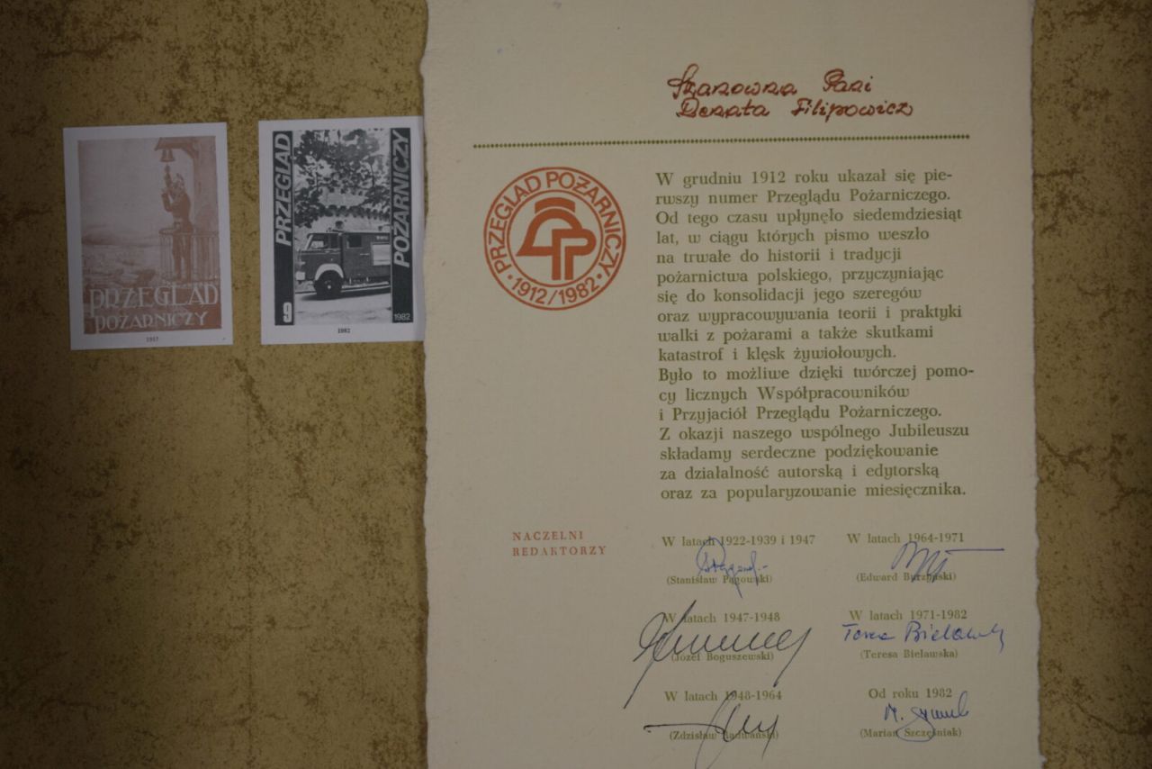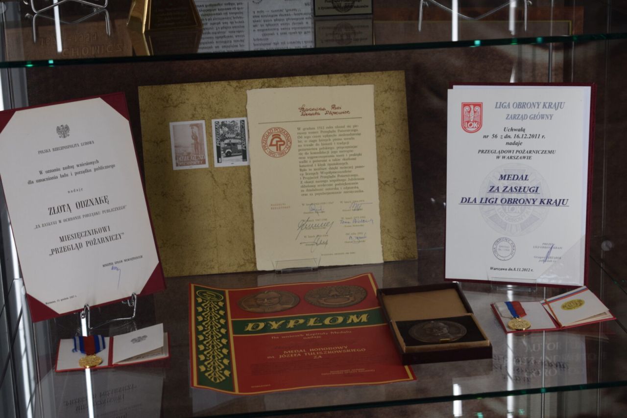 Ciekawostką na wystawie są oryginalne rysunki satyryczne o tematyce strażackiej autorstwa płk. Henryka Baranowskiego z Kutna, publikowane na łamach „Przeglądu” w latach 90. XX w. Nie mogło też zabraknąć oryginalnych egzemplarzy pisma. Najstarsze pochodzą z lat 30. XX w. Są też wydania jubileuszowe z 1922, 2012 i 2022 r. Zwiedzający zobaczą niezwykle ciekawe okładki periodyku zaprojektowane w stylu modernistycznym w latach 70 XX w. przez Tadeusza Pietrzyka, który odnosił międzynarodowe sukcesy w dziedzinie artystycznej sztuki użytkowej. Sumując, wystawa podejmuje po raz pierwszy temat historii prasy pożarniczej, ze szczególnym uwzględnieniem pożarnictwa zawodowego.