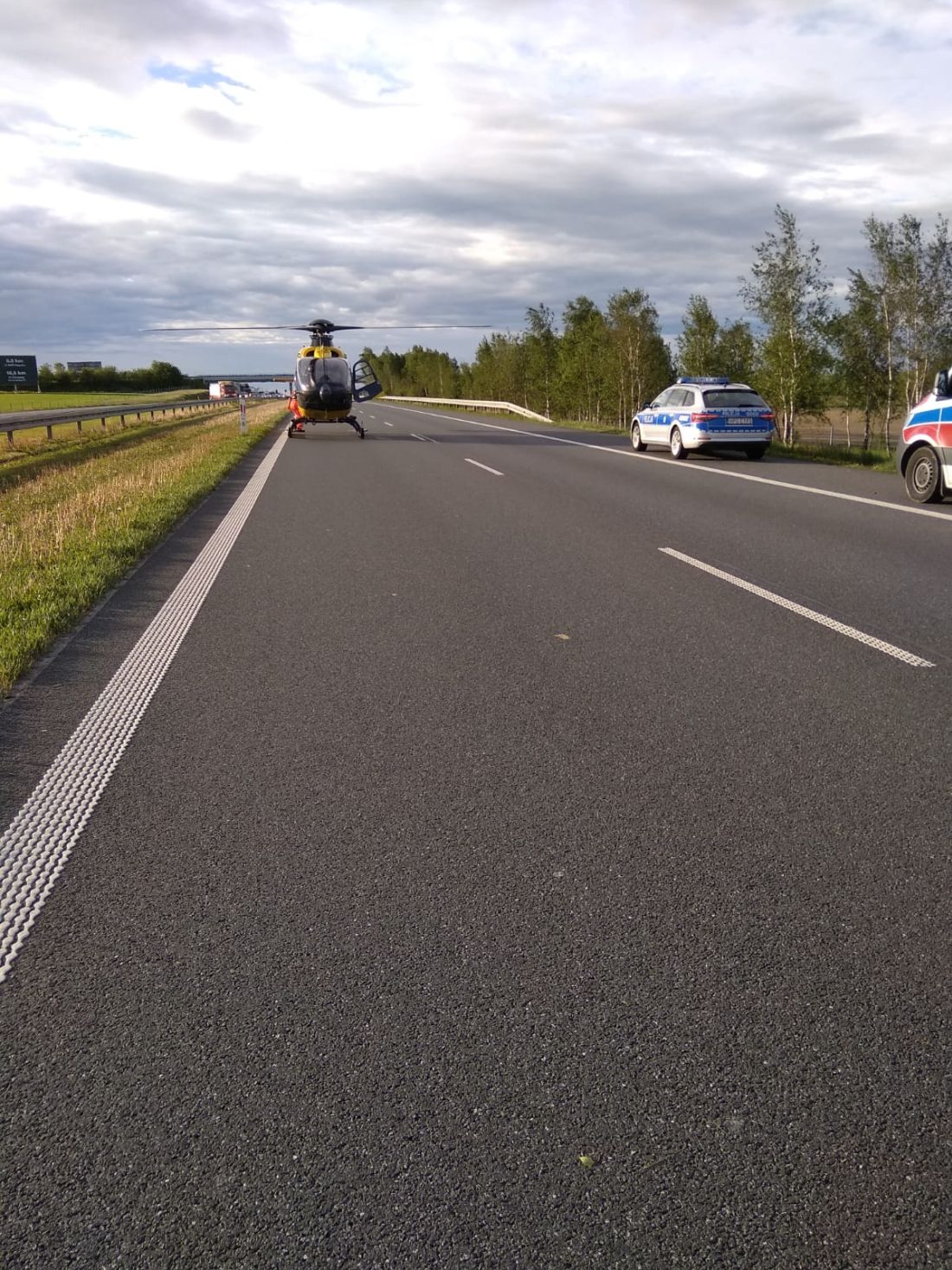 Zespół ratownictwa medycznego, który przybył na miejsce, zadecydował, że kobieta wymaga transportu do szpitala helikopterem lotniczego pogotowia ratunkowego. W celu zabezpieczenia lądowania i startu śmigłowca LPR-u ruch na autostradzie został zamknięty w obu kierunkach. Przyczyny i okoliczności zdarzenia ustala policja.