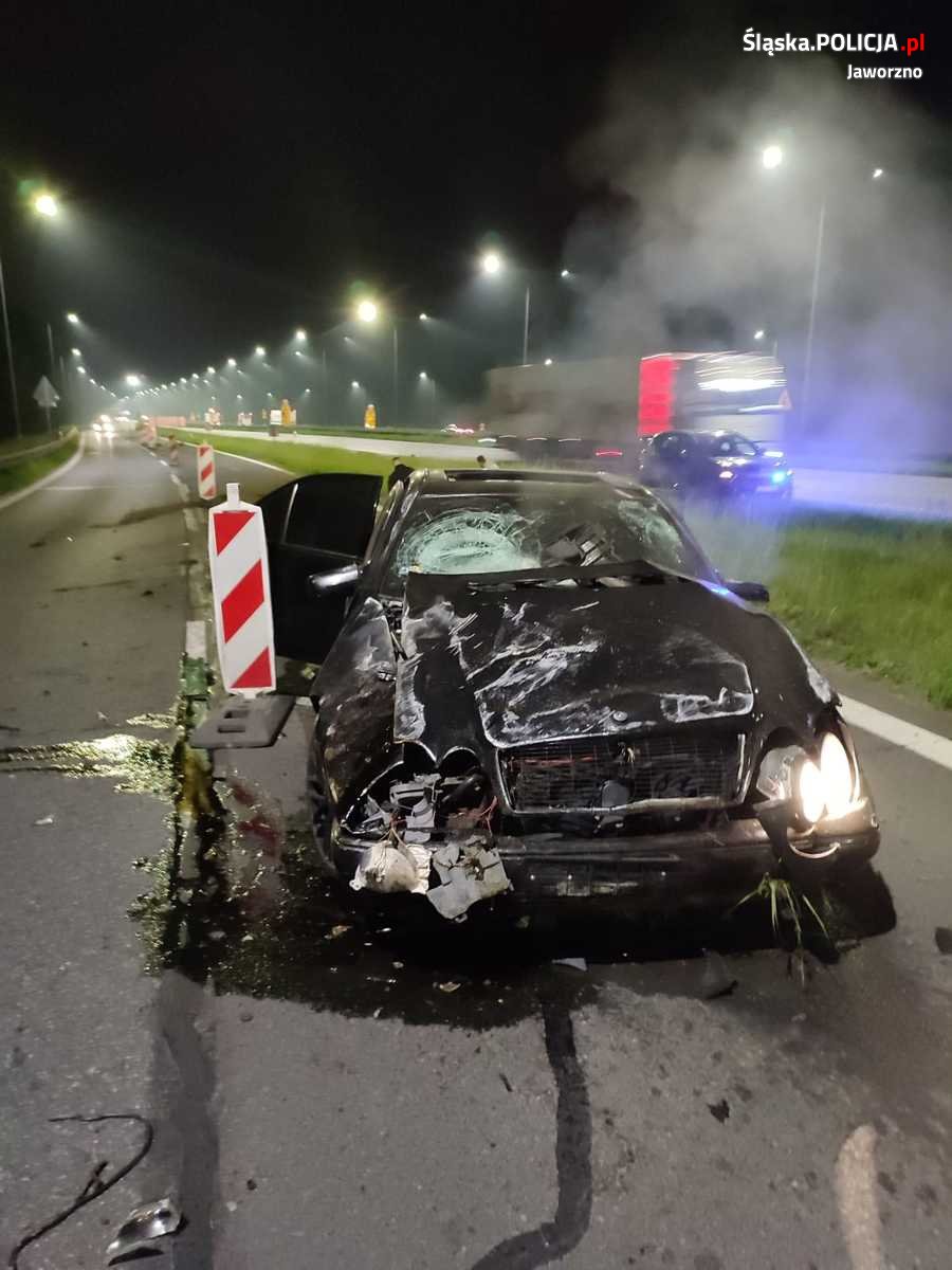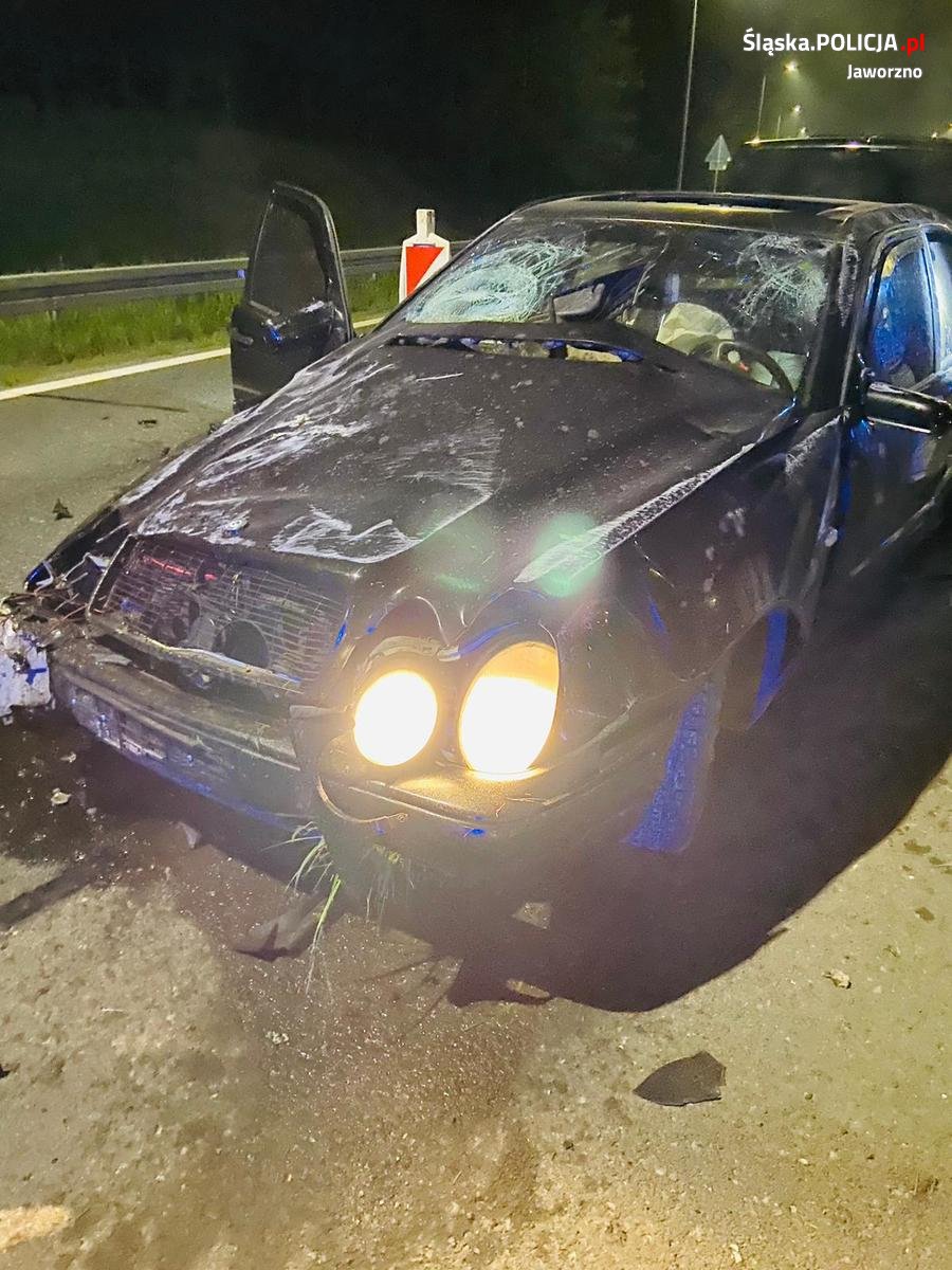 Do niebezpiecznego pościgu doszło w miniony piątek w nocy. Kryminalni z jaworznickiej komendy postanowili skontrolować kierowcę i pasażera czarnego mercedesa, który w godzinach nocnych zaparkował na MOP-ie Zastawie przy autostradzie A4 w Jaworznie. Jeden z nieumundurowanych policjantów podszedł do kierowcy i okazał mu legitymację służbową. Na widok kryminalnego mężczyzna zaczął gwałtownie cofać, potrącił go i zaczął uciekać. Stróże prawa natychmiast ruszyli w pościg, do którego wkrótce przyłączyły się inne będące w okolicy patrole. Oficer dyżurny zlecił ustawienie posterunków blokadowych oraz zaangażował w pościg kolejne siły policyjne. Poruszający się mercedesem mężczyźni nie zamierzali się jednak zatrzymywać i nie reagowali na nadawane przez radiowóz sygnały świetlne i dźwiękowe. W trakcie pościgu, jadąc z dużą prędkością, staranowali szlaban punktu poboru opłat na autostradzie A4 i jechali dalej w kierunku Mysłowic. Pościg zakończył się na terenie tego miasta, gdzie ostatecznie kierowca stracił panowanie nad pędzącym mercedesem, w wyniku czego auto dachowało. Sprawcy opuścili pojazd o własnych siłach i próbowali kontynuować ucieczkę pieszo, jednak już po chwili byli w rękach kryminalnych. W trakcie przeszukania policjanci ujawnili w mercedesie m.in. narkotyki, gotówkę, telefony komórkowe i kominiarkę. Okazało się, że 23-letni kierujący był poszukiwany sześcioma listami gończymi oraz posiadał trzy aktywne zakazy prowadzenia pojazdów.