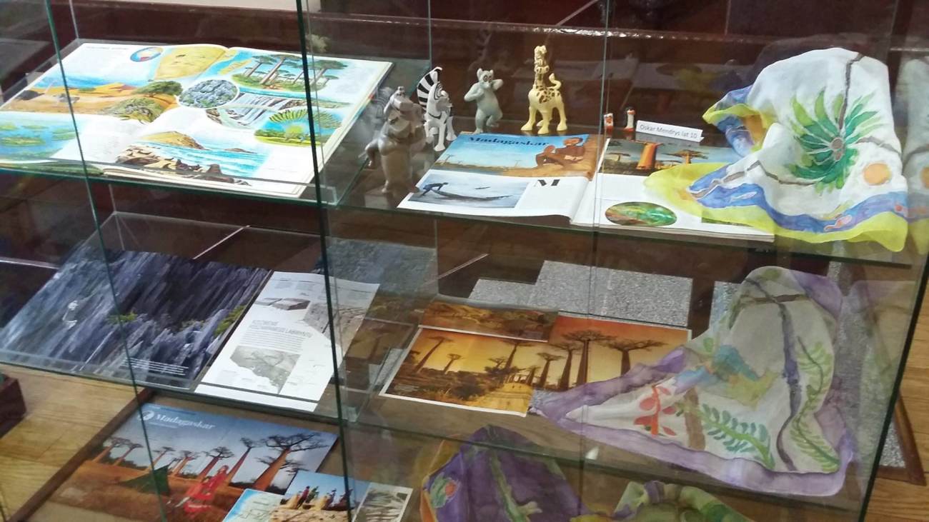 Tematyką wystawy jest wyjątkowa wyspa Madagaskar, a konkretnie jej ginący świat fauny i flory. Wyspa zamieszkana przez niewielu ludzi, ale mnóstwo dzikich gatunków zwierząt, nieznanych na żadnym innym kontynencie. Ten piękny kolorowy świat przedstawiony jest równie kolorowo i pomysłowo na styropianowych tablicach. Ściany bibliotecznego holu zdobi 20 scen z afrykańskiej wyspy, którą podziwiają nieustannie czytelnicy biblioteki.