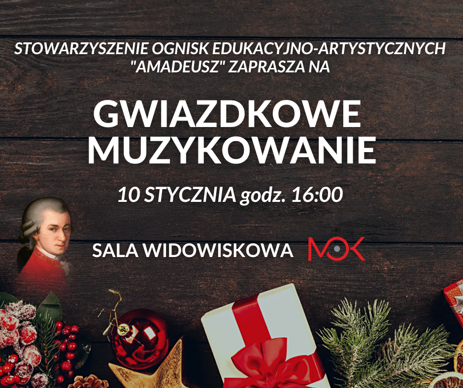 10 stycznia o godz. 16 w sali widowiskowej Mysłowickiego Ośrodka Kultury odbędzie się koncert „Gwiazdkowe muzykowanie”, organizowany przez Stowarzyszenie Ognisk Edukacyjno-Artystycznych „Amadeusz”.
