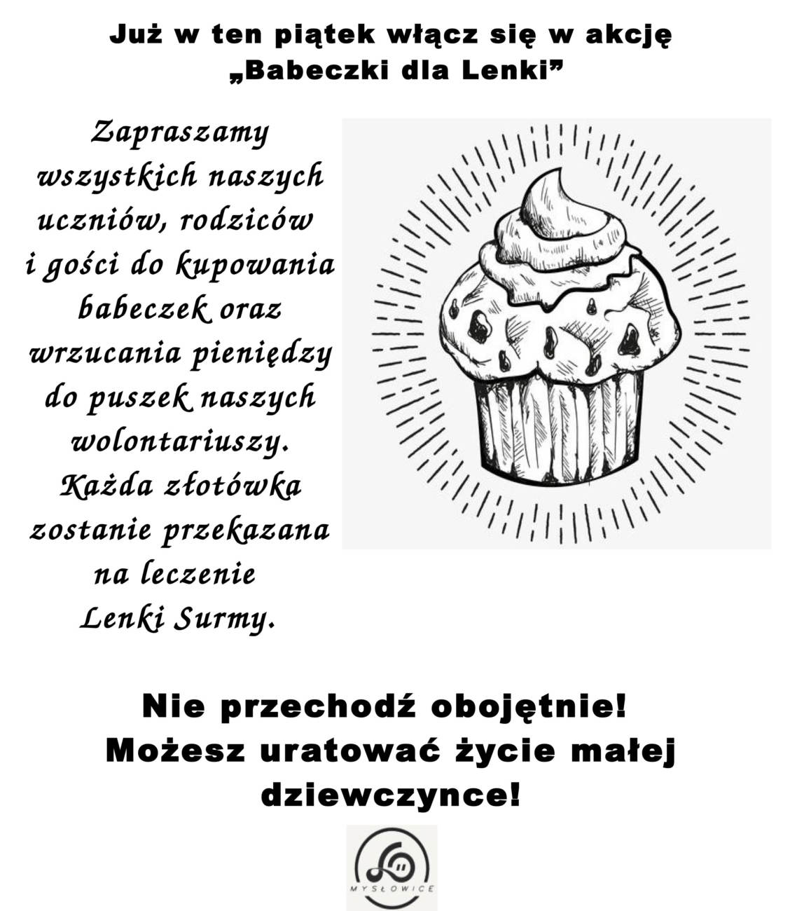 Do wzrostu stanu konta na leczenie Lenki zachęcamy smakoszy słodkich babeczek. Ich kiermasze odbędą się w Szkole Podstawowej nr 7 przy ul. Górniczej, Zespole Szkolno- Przedszkolnym nr 1 w Brzęczkowicach oraz w II Liceum Ogólnokształcącym. W SP 7 kiermasz odbędzie się w czwartek i piątek 11 i 12 stycznia popołudniu. W II LO kiermasz odbędzie się w piątek 12 stycznia w godzinach 8.15-12.00 lub do wyczerpania babeczek.