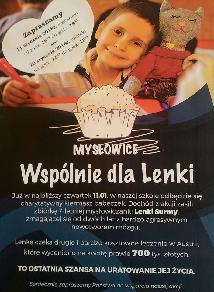 Pomocną dłoń dziewczynce wyciągnęło Przedszkole nr 5 w Mysłowicach. 19 stycznia odbędzie się tam 11 edycja Koncertu Zimowego z licytacjami, a część dochodów zasili konto Leny. Zanim wybierzecie się tam na koncert, sprawdźcie, czy możecie przekazać przedszkolu coś ciekawego na licytacje – właśnie trwa zbiórka, przeczytajcie: Przedszkole pomoże Lence. Trwa zbiórka fantów na licytację.