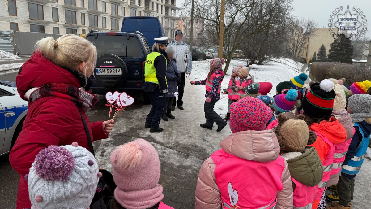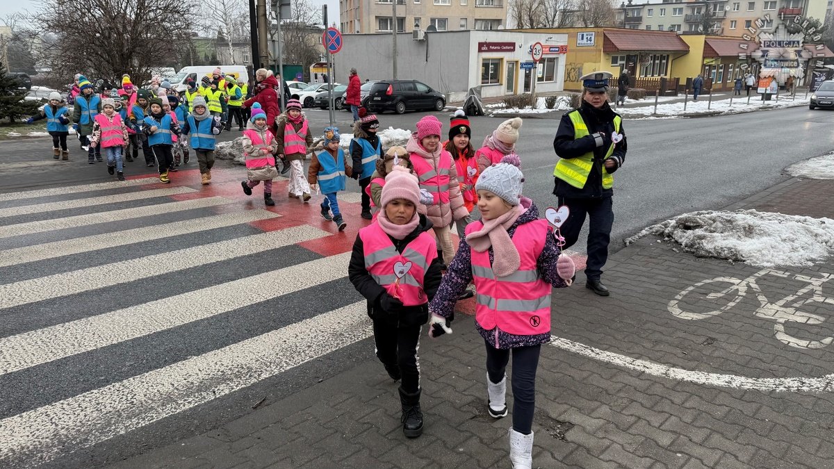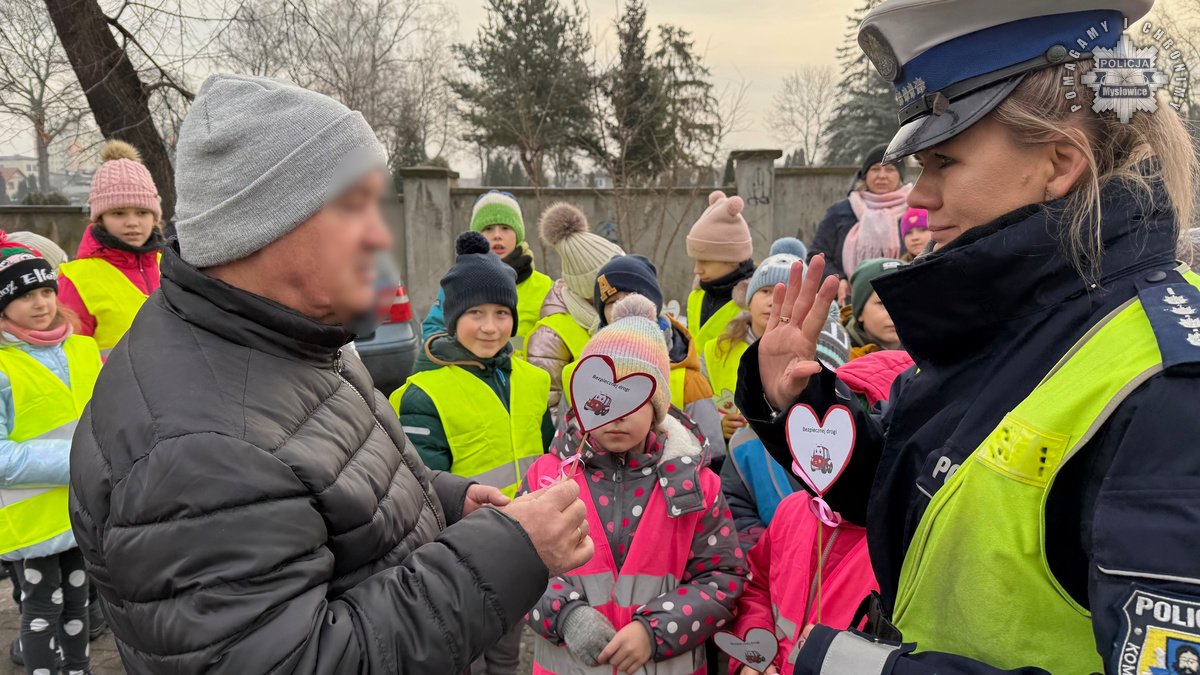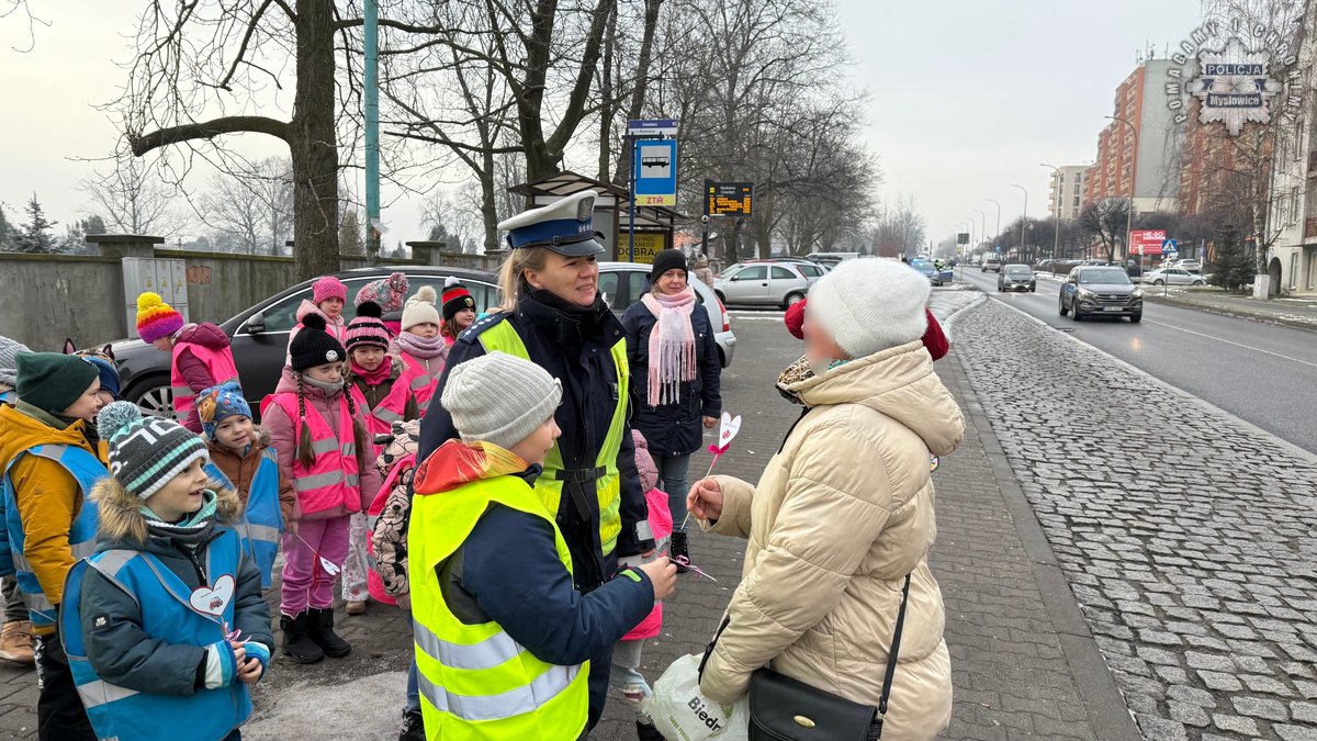 W ramach działań profilaktycznych policjanci i uczniowie odwiedzili okolice przejść dla pieszych w Mysłowicach. Mundurowi zwracali uwagę na kluczowe kwestie związane z bezpieczeństwem, takie jak widoczność czy zagrożenia wynikające ze śliskiej nawierzchni. Dzieci obdarowywały napotkanych seniorów symbolicznymi serduszkami, które miały przypominać o ostrożności i rozwadze na drodze.