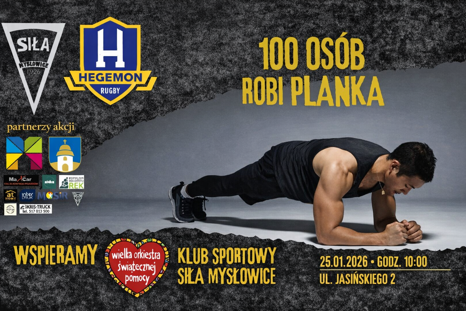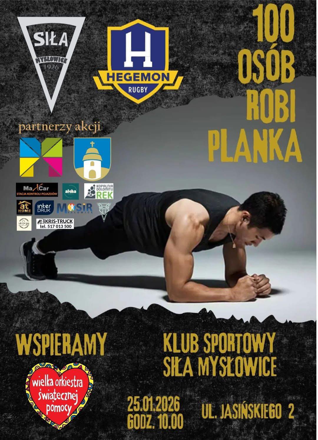 W niedzielę, 25 stycznia o godzinie 10.00 w Klubie Sportowym Siła Mysłowice przy ul. Jasińskiego 2 rozpocznie się wydarzenie w ramach 34. Finału Wielkiej Orkiestry Świątecznej Pomocy. Uczestnicy zrobią tzw. „deskę” (plank).