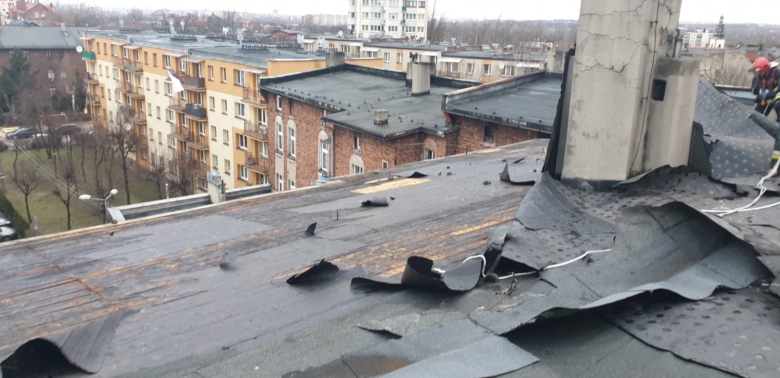 Zerwana elewacja z bloku przy ul. Katowickiej 73, zerwana papa na dachu w jednym z budynków przy Wyspiańskiego czy powalone drzewa i latarnie. Od wczesnych godzin porannych mysłowiccy strażacy usuwają skutki silnych wiatrów.