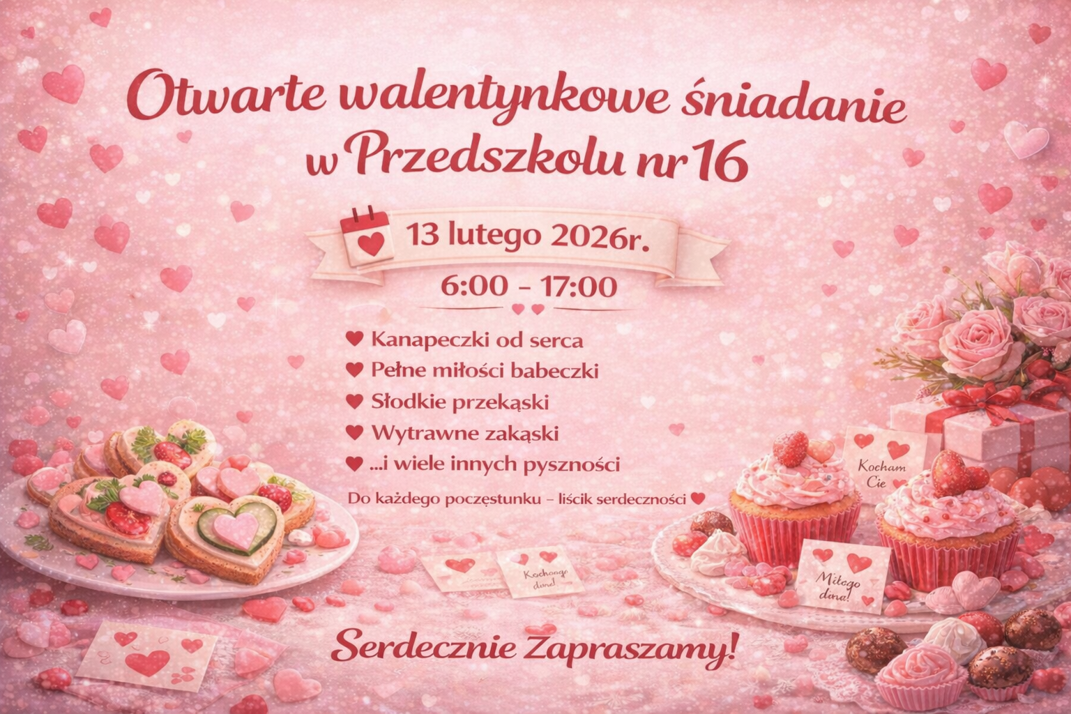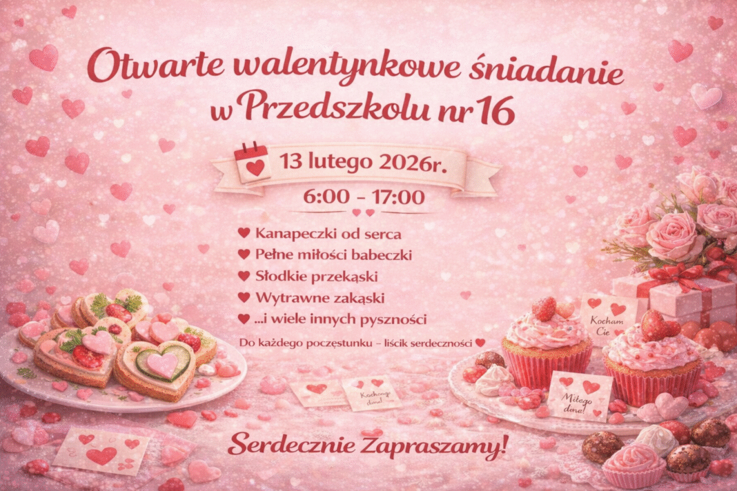 Przedszkole nr 16 zaprasza w piątek, 13 lutego, na otwarte walentynkowe śniadanie. Spotkanie rozpocznie się od szóstej rano.