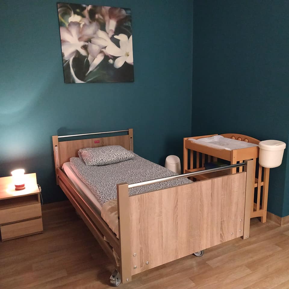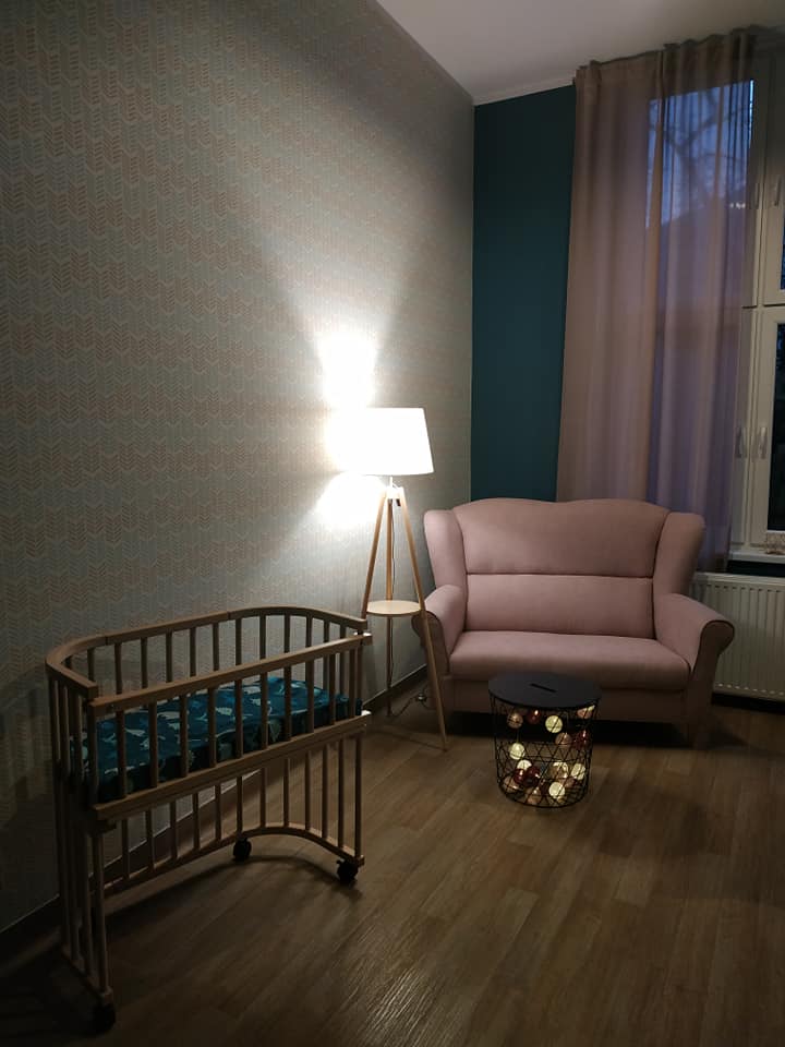 Nowa sala dla pacjentek po porodzie wystrojem bardziej kojarzy się z hotelowym pokojem niż szpitalem. Żywe kolory ścian, firanki i zasłonki w oknach, świece oraz ozdoby, a także komfortowe meble tworzą niezwykle przyjemny klimat. Pacjentka będzie mogła poczuć się tu jak w domu. Sala została wyposażona w wygodne łóżko dla mamy z szafką nocną oraz łóżeczko dla dziecka i przewijak, a także fotel i stolik. Pokój ma również własną łazienkę.