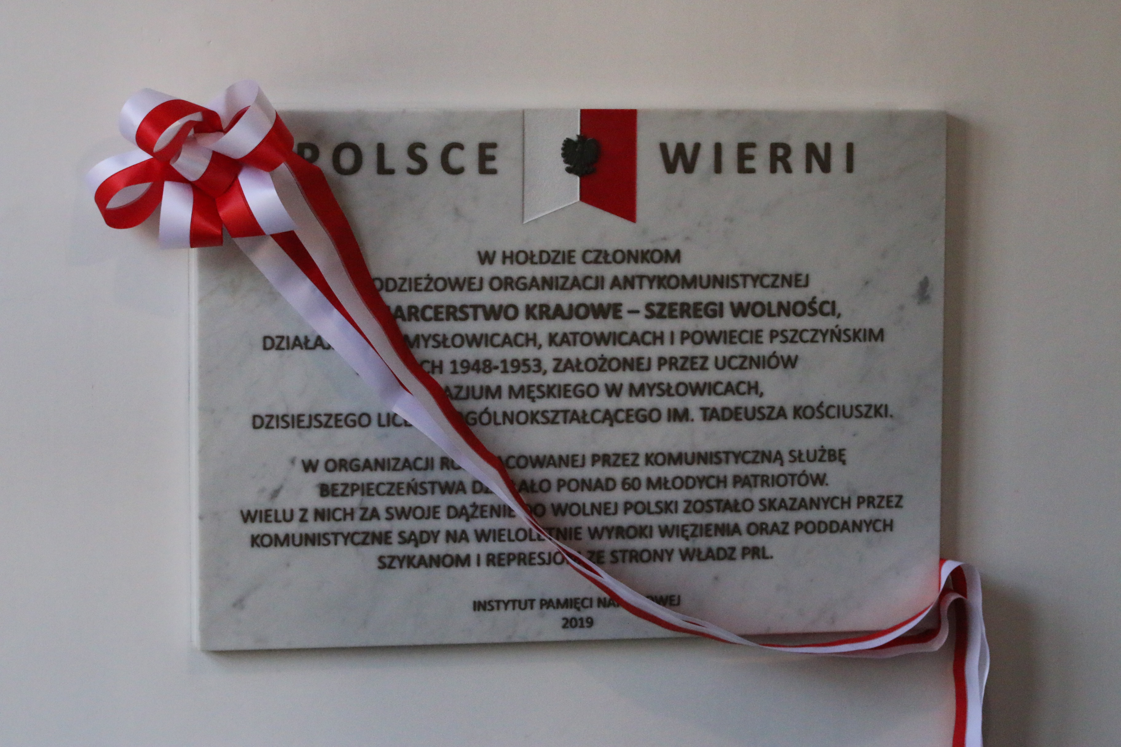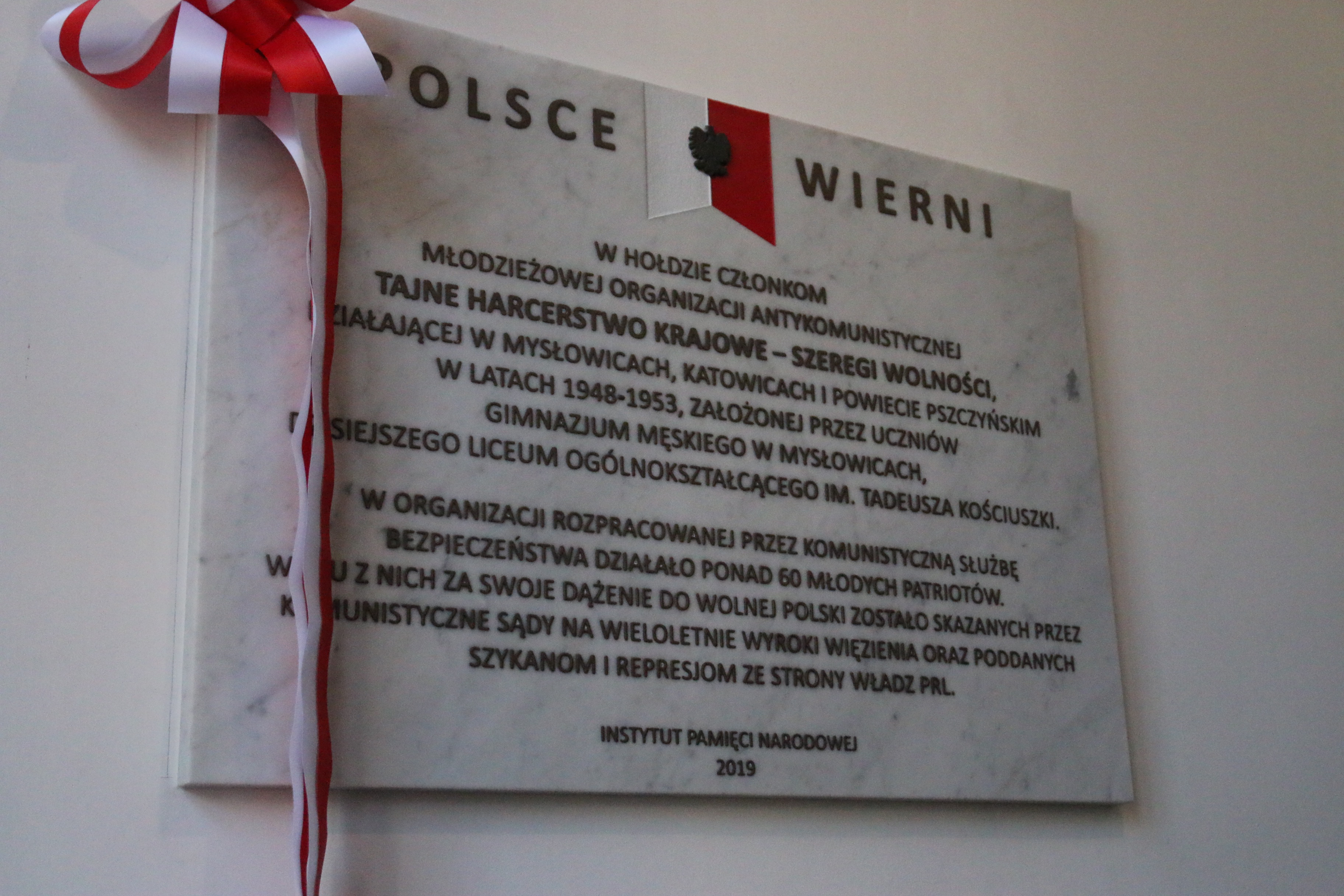 W przeddzień Narodowego Dnia Pamięci Żołnierzy Wyklętych w I Liceum Ogólnokształcącym im. T. Kościuszki została odsłonięta tablica upamiętniająca Tajne Harcerstwo Krajowe – Szeregi Wolności. To młodzieżowa organizacja antykomunistyczna działająca w Mysłowicach, Katowicach i powiecie pszczyńskim w latach 1948-1953. Założyli ją uczniowie mysłowickiego gimnazjum męskiego, dzisiejszego I LO właśnie.