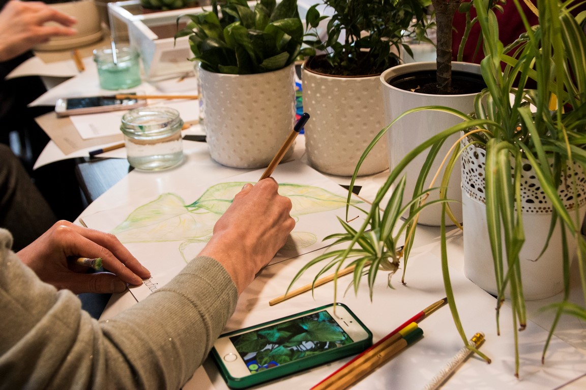 Spotkanie zaczęło się niedzielnym porankiem w Amarantus Sklep i Kawiarnia. Na tapecie spotkania, a zarazem na akwarelowym papierze, głównym tematem były motywy botaniczne. Warsztaty rozpoczęło krótkie, teoretyczne wprowadzenie – kilka słów o budowaniu kompozycji dzieł, technice akwareli oraz niezbędnych, malarskich narzędziach. Część praktyczna, pełna pochwał i rad, zaowocowała dziesięcioma różnymi pracami na dużym formacie. Każdej z uczestniczek, niezależnie od etapu artystycznego rozwoju, udało się zainspirować roślinami, którymi bogato zastawiono stół, i stworzyć unikatowy malunek. Ale to nie koniec akwarelowych inicjatyw ze strony Fiou Fiou.