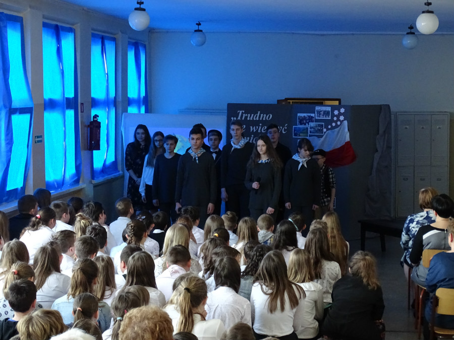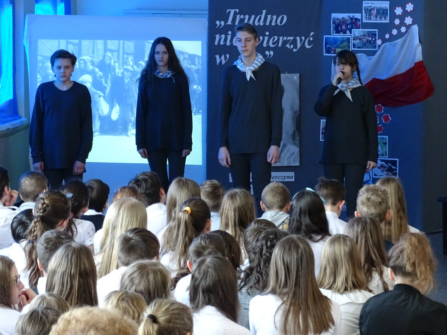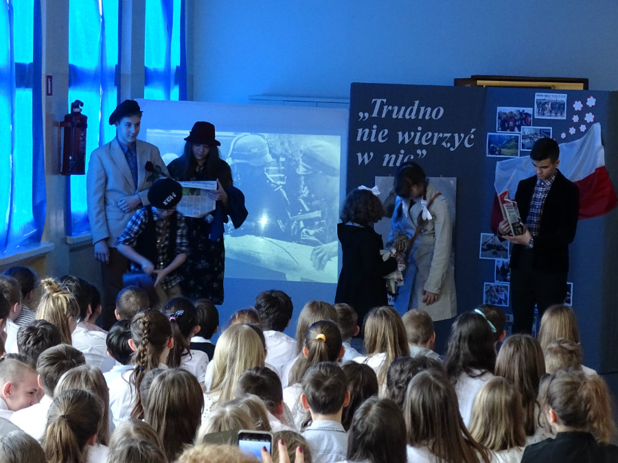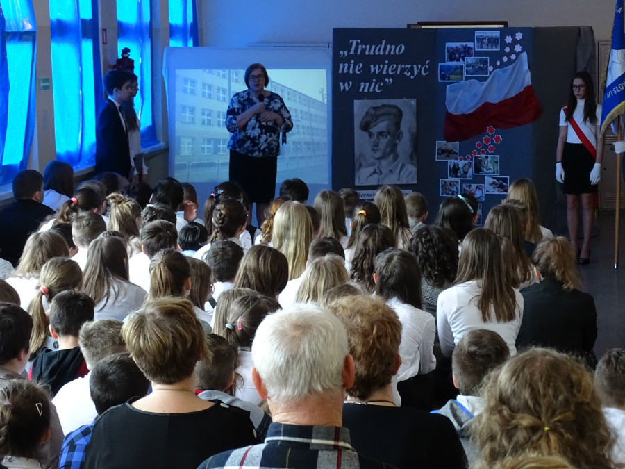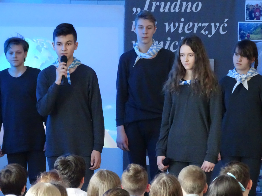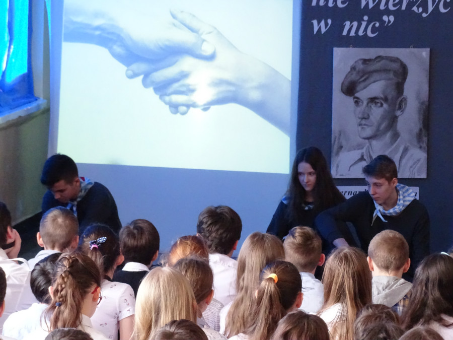 Uroczysta akademia rozpoczęła się o godz. 11, a jej mottem stały się słowa piosenki zespołu Raz Dwa Trzy „Trudno nie wierzyć w nic”. Uczniowie klas 7d, 7a, 6a i 4d wraz z nauczycielkami Agnieszką Ferenc i Magdaleną Jęczmyk przygotowali poruszający serca montaż poetycko-muzyczny. W niejednym oku zakręciła się łza, gdy młodzi artyści przedstawiali obrazy z życia Bernarda Świerczyny.