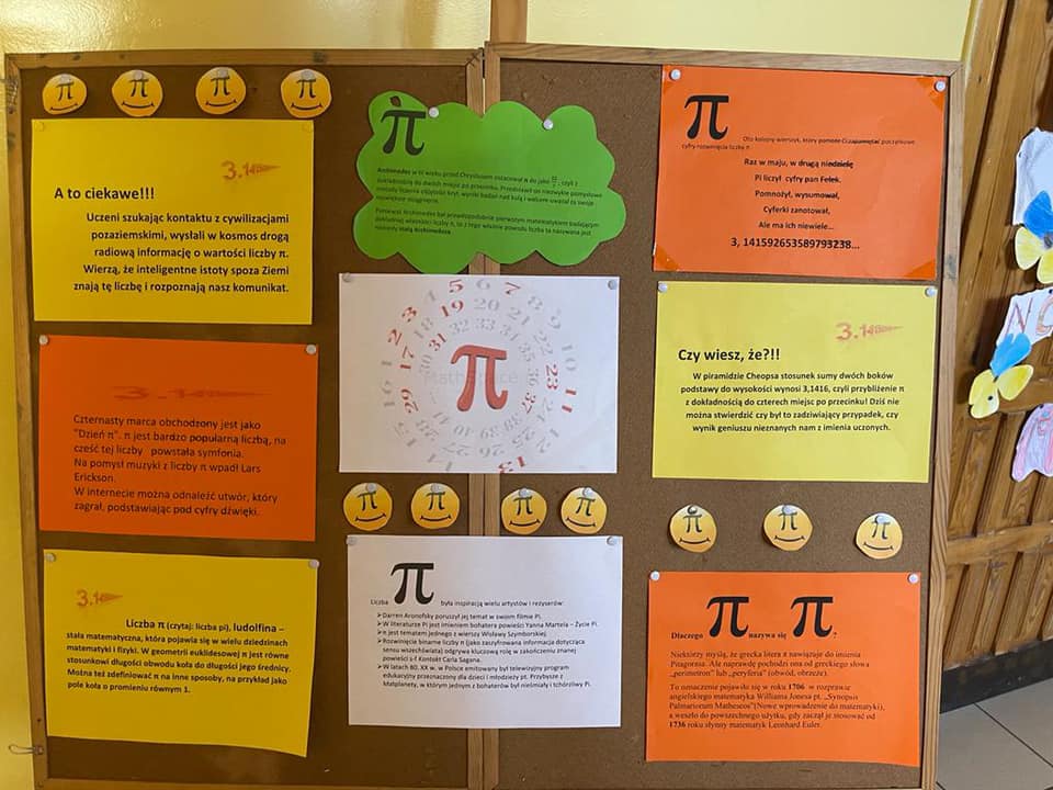 Ta niesamowita liczba, znana wszystkim jako 3,14, skrywa w sobie mnóstwo tajemnic, o czym uczniowie szkoły sportowej mogli się osobiście przekonać w poniedziałek 14 marca. Korytarz szkolny ozdobiło rozwinięcie dziesiętne liczby pi. Na lekcjach było kolorowo i przede wszystkim bardzo interesująco. Nie zabrakło kolorowanek, gazetek czy liczby pi ułożonej z zakrętek. Klasy 7. i 8. podjęły wyzwanie i spróbowały doświadczalnie wyznaczyć przybliżenia poniedziałkowej „solenizantki”. Nad wszystkim czuwały matematyczki Dominika Gołda i Katarzyna Łukaszczyk.