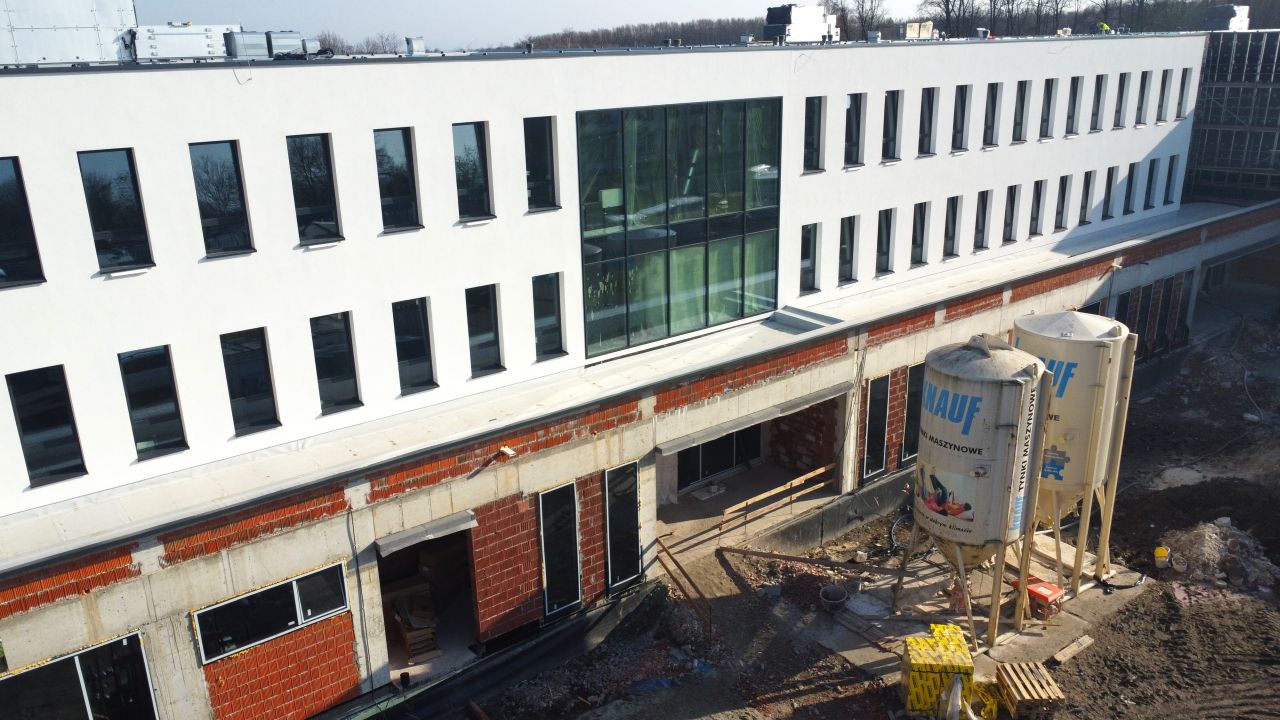 Na ten moment możemy zobaczyć już stojący budynek pokryty dachem, na którym znajdują się panele fotowoltaiczne. Pracownicy budowy są obecnie na etapie wykańczania wnętrza oraz zakończenia prac związanych z pokryciem elewacji. Na pierwszym i drugim piętrze budynku zostały już wykonane wylewki, a obecnie prace pod tym względem prowadzone są na parterze.