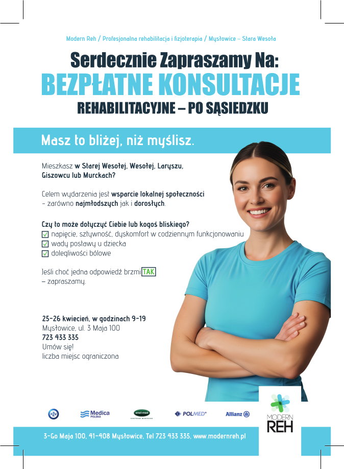 25 i 26 kwietnia w godzinach od 9:00 do 19:00 w centrum rehabilitacji Modern Reh przy ul. 3 Maja 100 w Mysłowicach odbędą się Dni Otwarte pod hasłem „Bez bólu po sąsiedzku”.