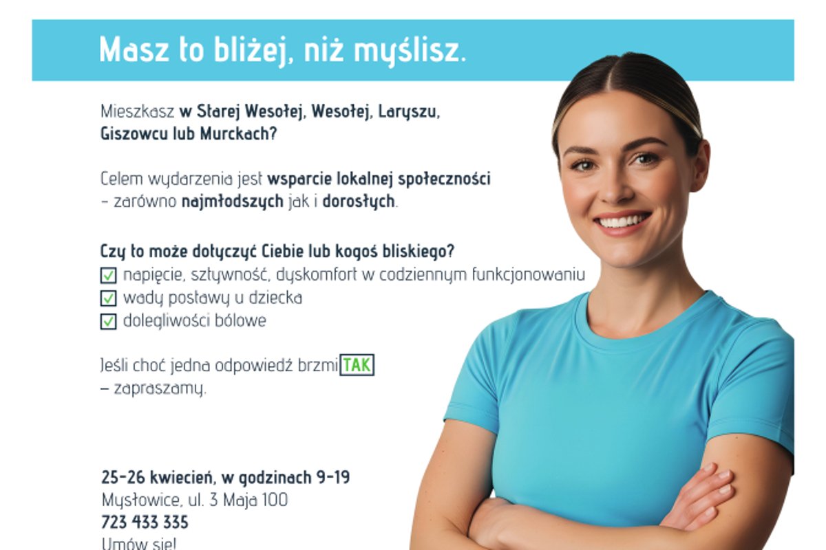 W ramach wydarzenia mieszkańcy będą mogli skorzystać z bezpłatnych, indywidualnych konsultacji rehabilitacyjnych dla dzieci, młodzieży i dorosłych. W programie zaplanowano m.in. wstępną ocenę dolegliwości bólowych i napięć w ciele, ocenę postawy, konsultacje dotyczące bólu kręgosłupa i stawów oraz indywidualne wskazówki terapeutyczne i profilaktyczne.