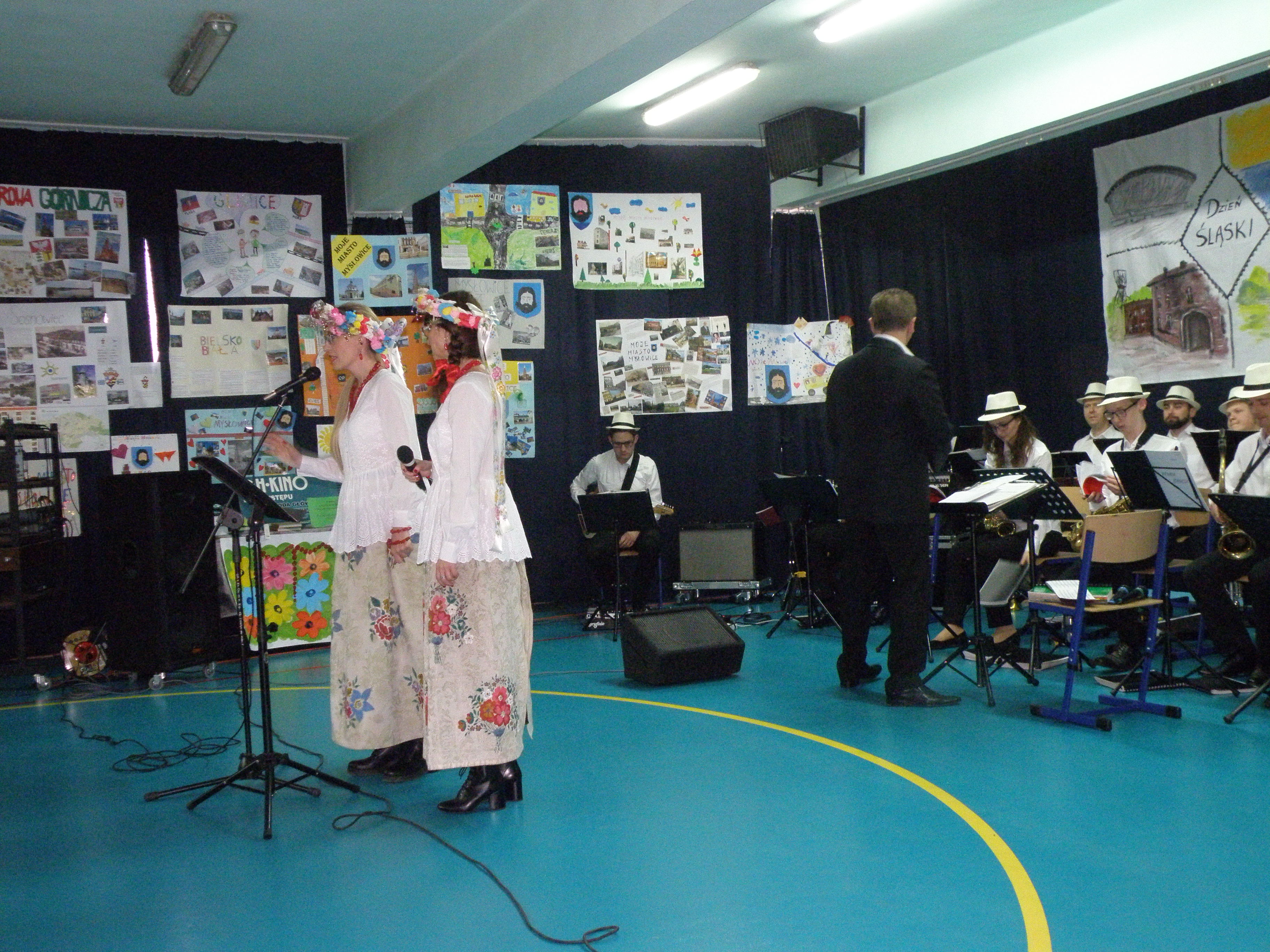 Do zabawy przygrywał Happy Big Band pod wodzą dyrygenta Mirosława Kaszuby, śpiewała ich znakomita solistka Anna Kamyk, ale swoje występy dały również dzieci z tej szkoły, tworząc świetny chórek. Były śląskie tańce w wykonaniu uczniów i śpiewy specjalnie zaproszonych gości z zespołu folklorystycznego Dziećkowiczanki pod kierunkiem Benedykta Daneckiego. „Karliczek” czy „Karolinka” – słowa tych znanych piosenek słychać było na szkolnych korytarzach, ale nie zabrakło też biesiadnej piosenki „Sokoły” czy tej o śląskich powstańcach. Gardeł nie szczędzono przy wspólnym śpiewie, bo jak się bawić, to tylko na biesiadzie w Jedynce.