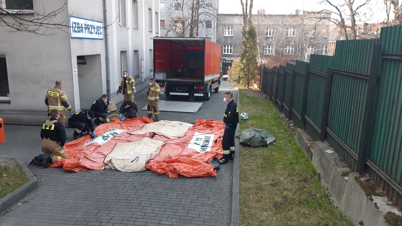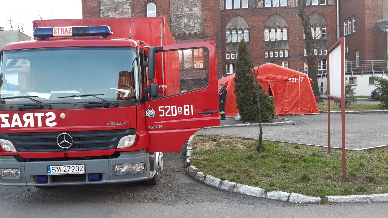 Mysłowiccy strażacy wspierają szpitale w działaniach związanych z walką COVID-19, m.in. poprzez ustawianie namiotów przed izbami przyjęć dwóch mysłowickich szpitali.