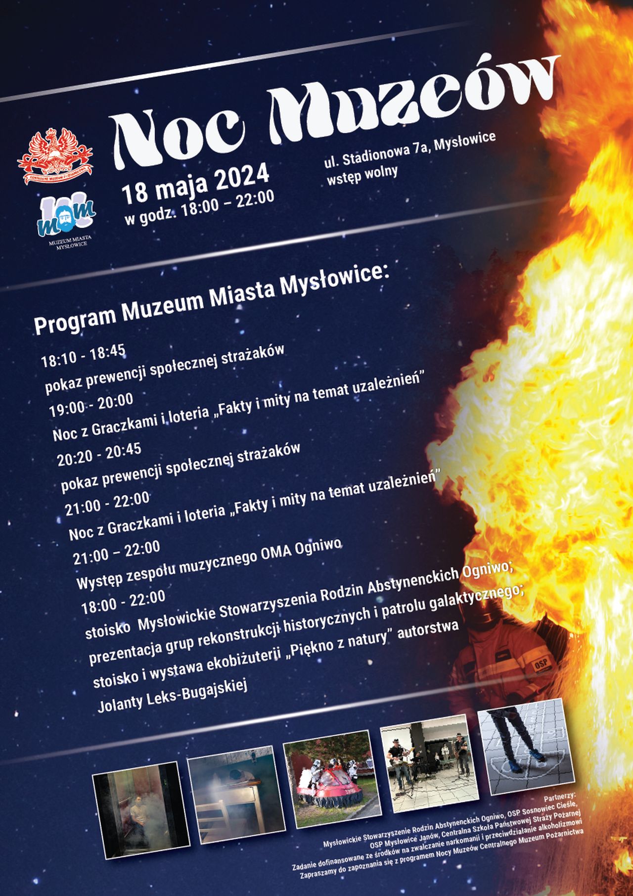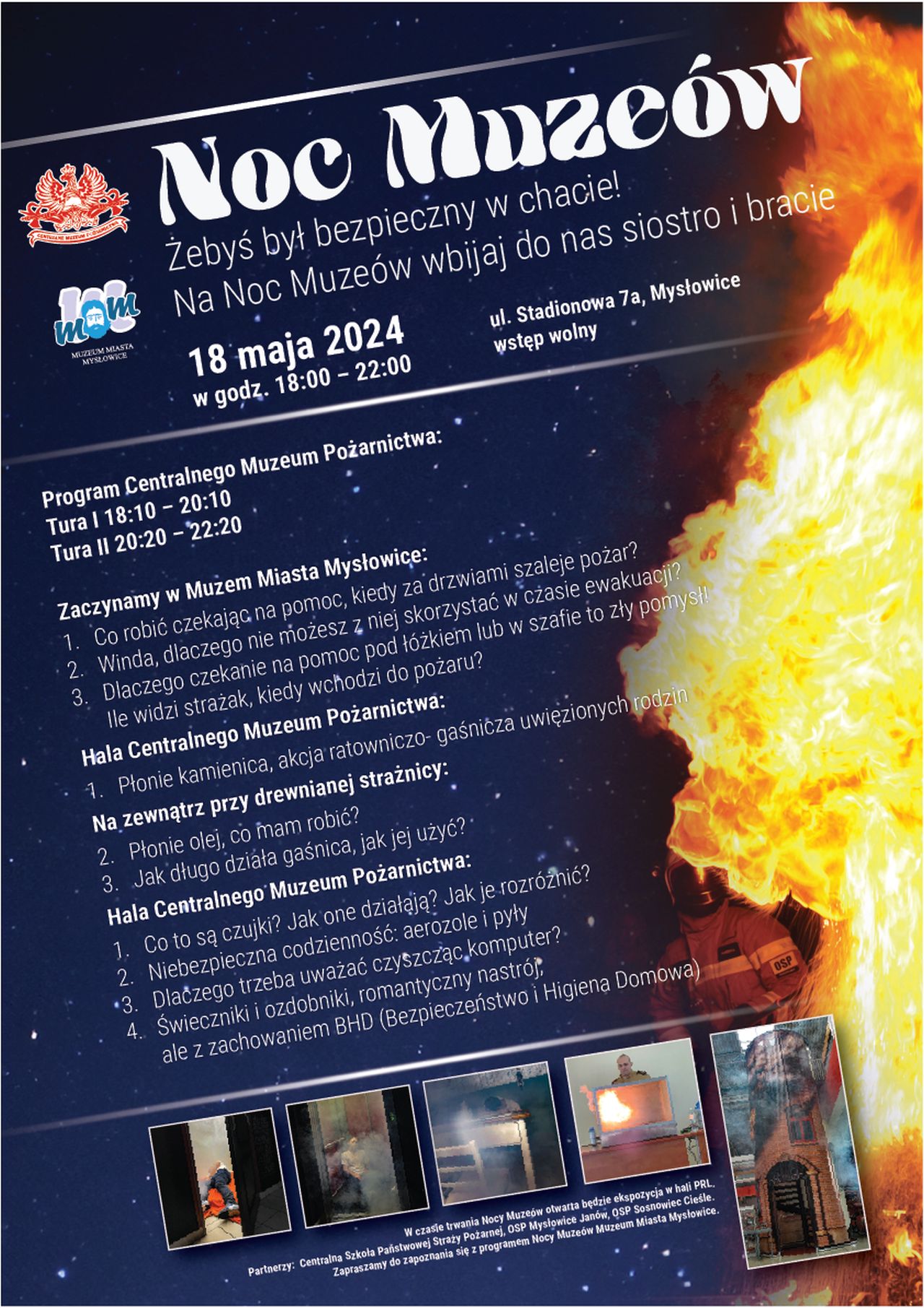 Wydarzenie podzielone zostało na dwie tury, pierwsza odbędzie się w godz. 18.10-20.10, a druga w godz. 20.20-22.20. Obchody rozpoczną się w Muzeum Miasta Mysłowice, gdzie uczestnicy będą mieli okazję dowiedzieć się m.in. jak zachować się w sytuacji pożaru w domu oraz przekonać się, ile widzi strażak wchodzący do pożaru. Następnie w Centralnym Muzeum Pożarnictwa przedstawiona zostanie akcja ratowniczo-gaśnicza rodzin uwięzionych podczas pożaru kamienicy. Przy drewnianej strażnicy zgromadzeni dowiedzą się, jak zachować się w sytuacji zapalenia się oleju oraz jak użyć gaśnicy. W Hali Centralnego Muzeum Pożarnictwa przygotowano natomiast prelekcje o czujkach, niebezpiecznych aerozolach i płynach codziennego użytku oraz wiele innych ciekawych atrakcji. W czasie trwania „Nocy Muzeów” otwarta będzie także ekspozycja w hali PRL.