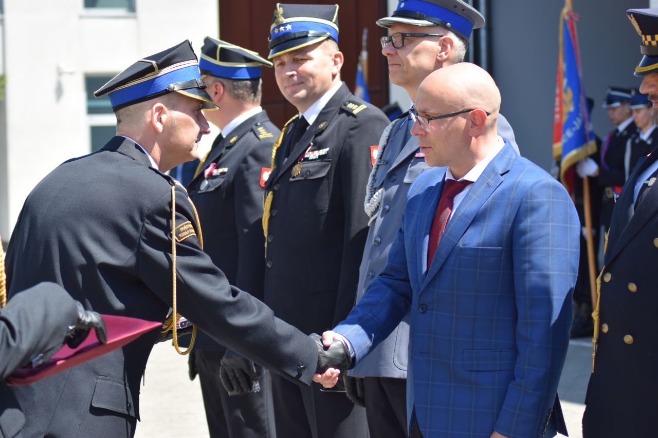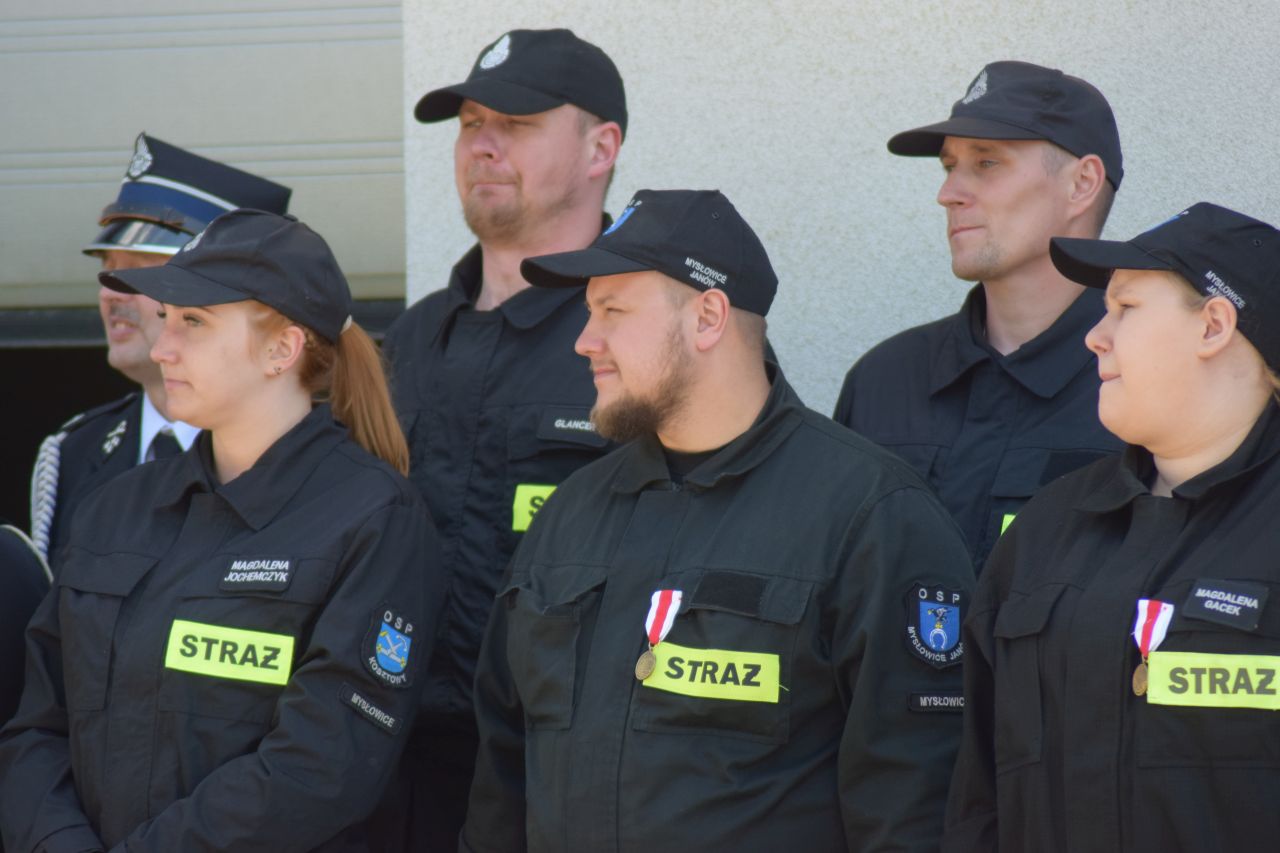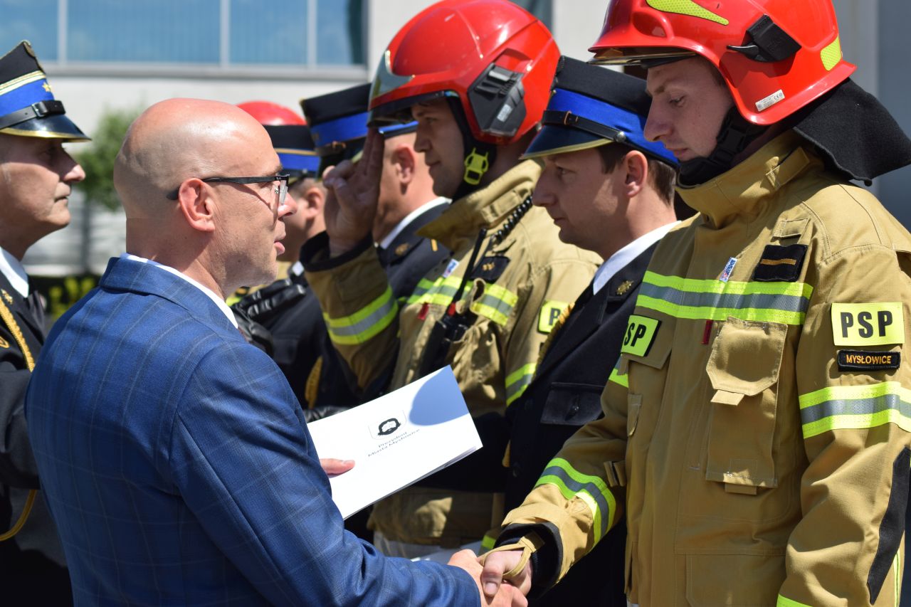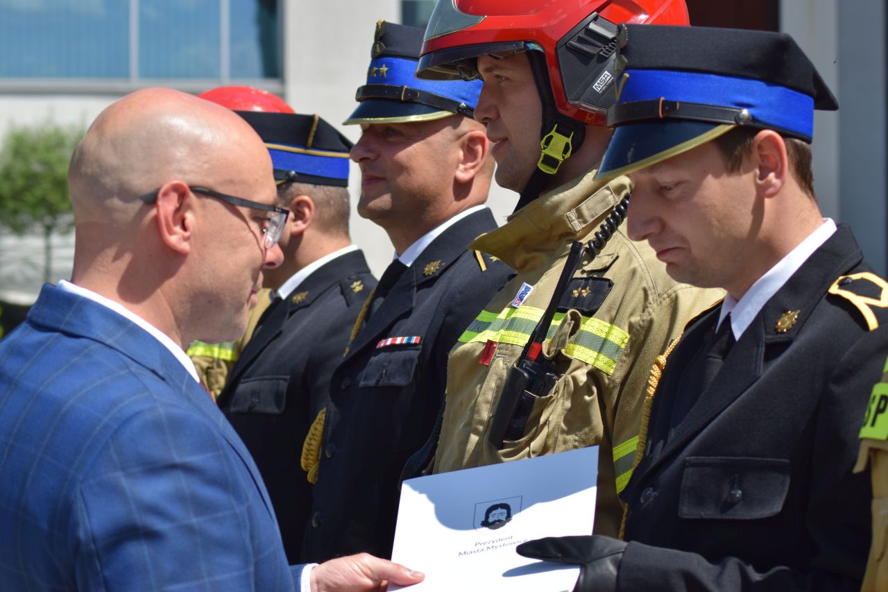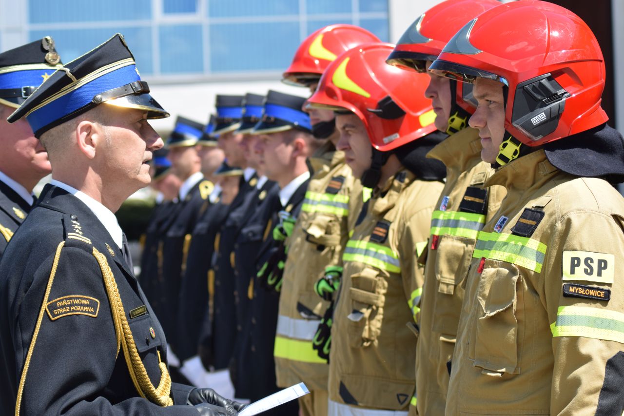 Uroczystość przed Komendą Miejską Państwowej Straży Pożarnej w Mysłowicach była okazją do wręczenia awansów na wyższe stopnie służbowe, odznaczeń i okolicznościowych medali z okazji 30-lecia PSP oraz prezydenckich nagród.