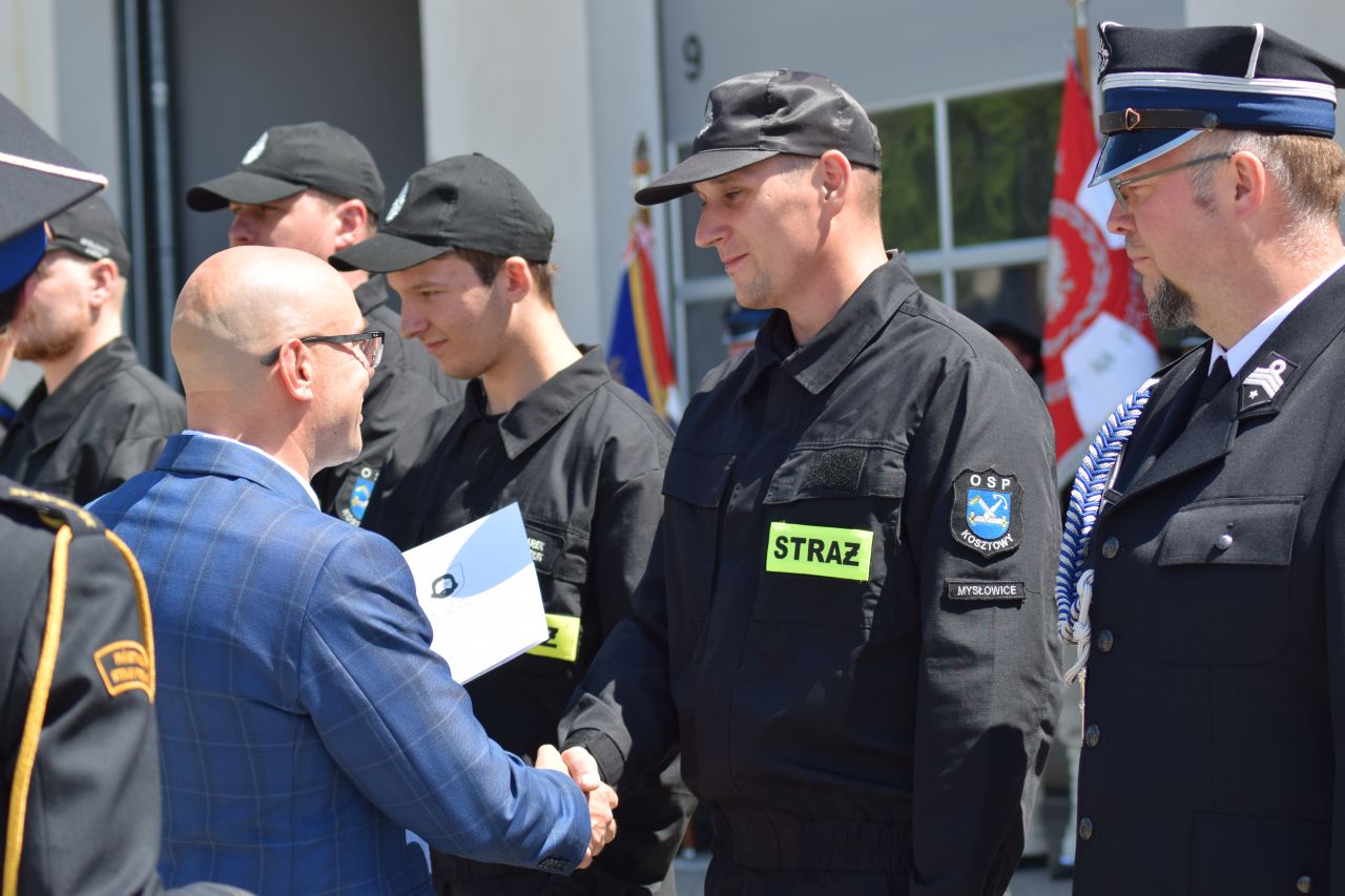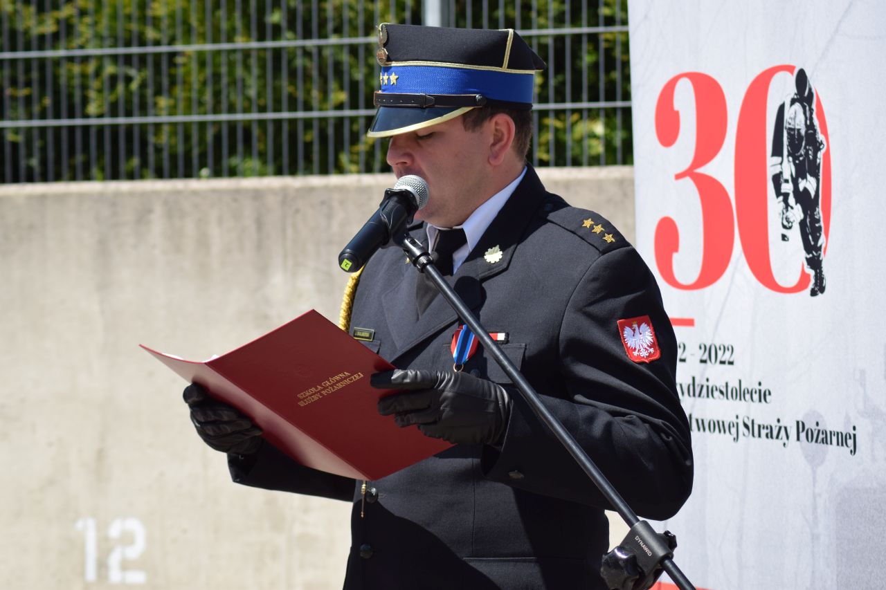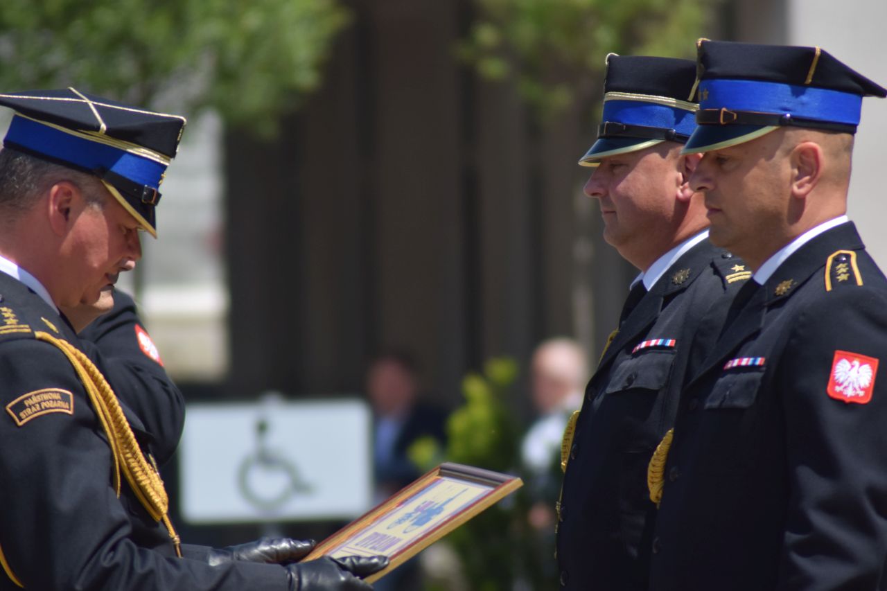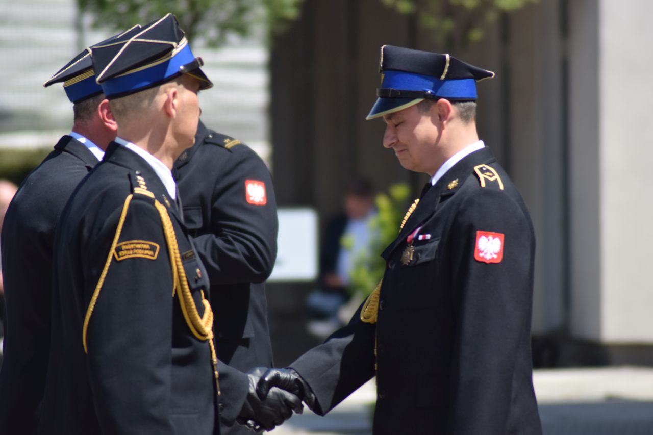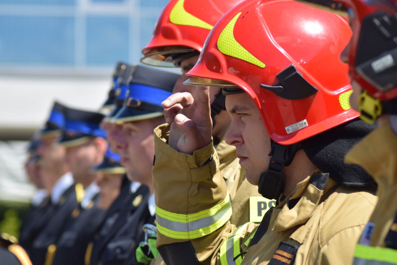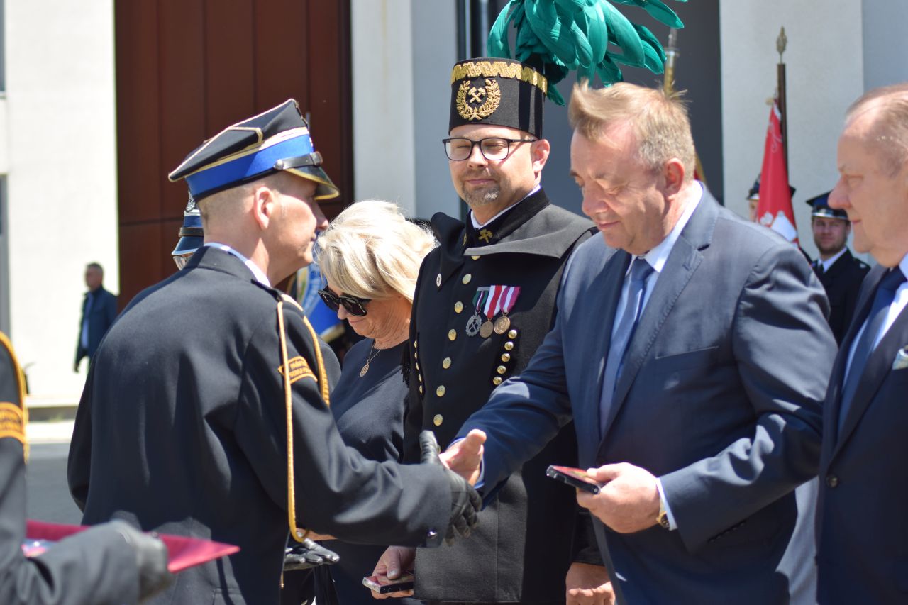 Uroczystość przed Komendą Miejską Państwowej Straży Pożarnej w Mysłowicach była okazją do wręczenia awansów na wyższe stopnie służbowe, odznaczeń i okolicznościowych medali z okazji 30-lecia PSP oraz prezydenckich nagród.