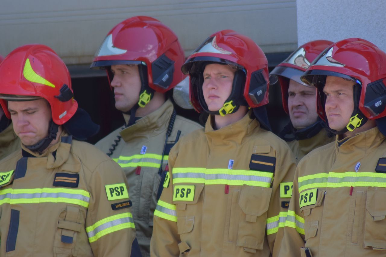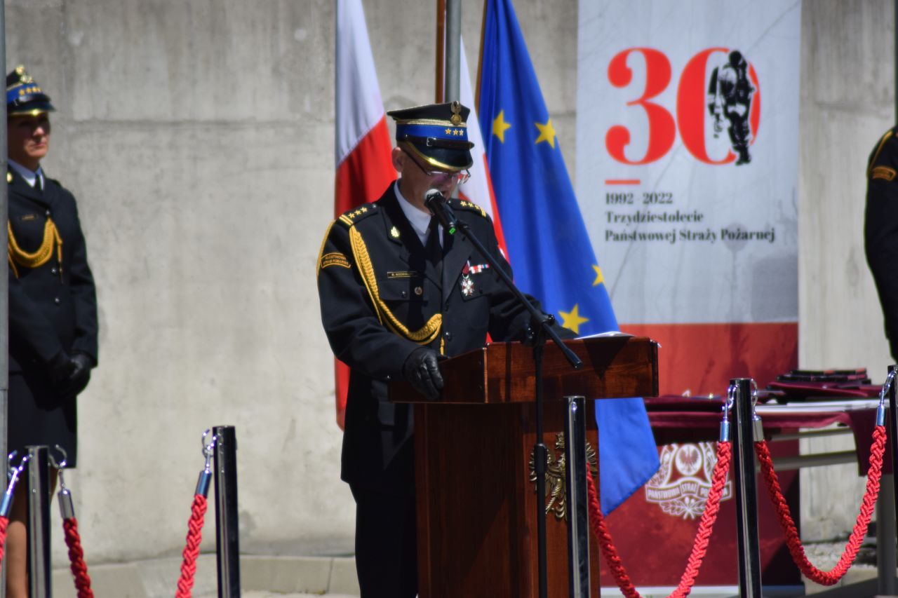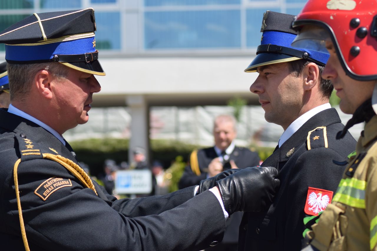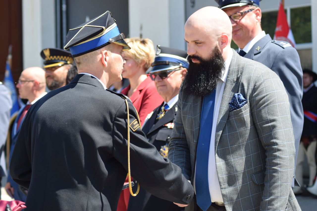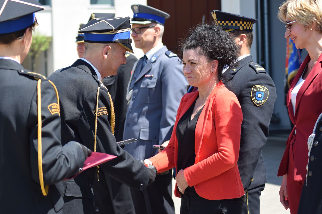Uroczystość przed Komendą Miejską Państwowej Straży Pożarnej w Mysłowicach była okazją do wręczenia awansów na wyższe stopnie służbowe, odznaczeń i okolicznościowych medali z okazji 30-lecia PSP oraz prezydenckich nagród.