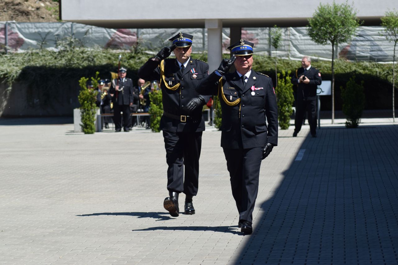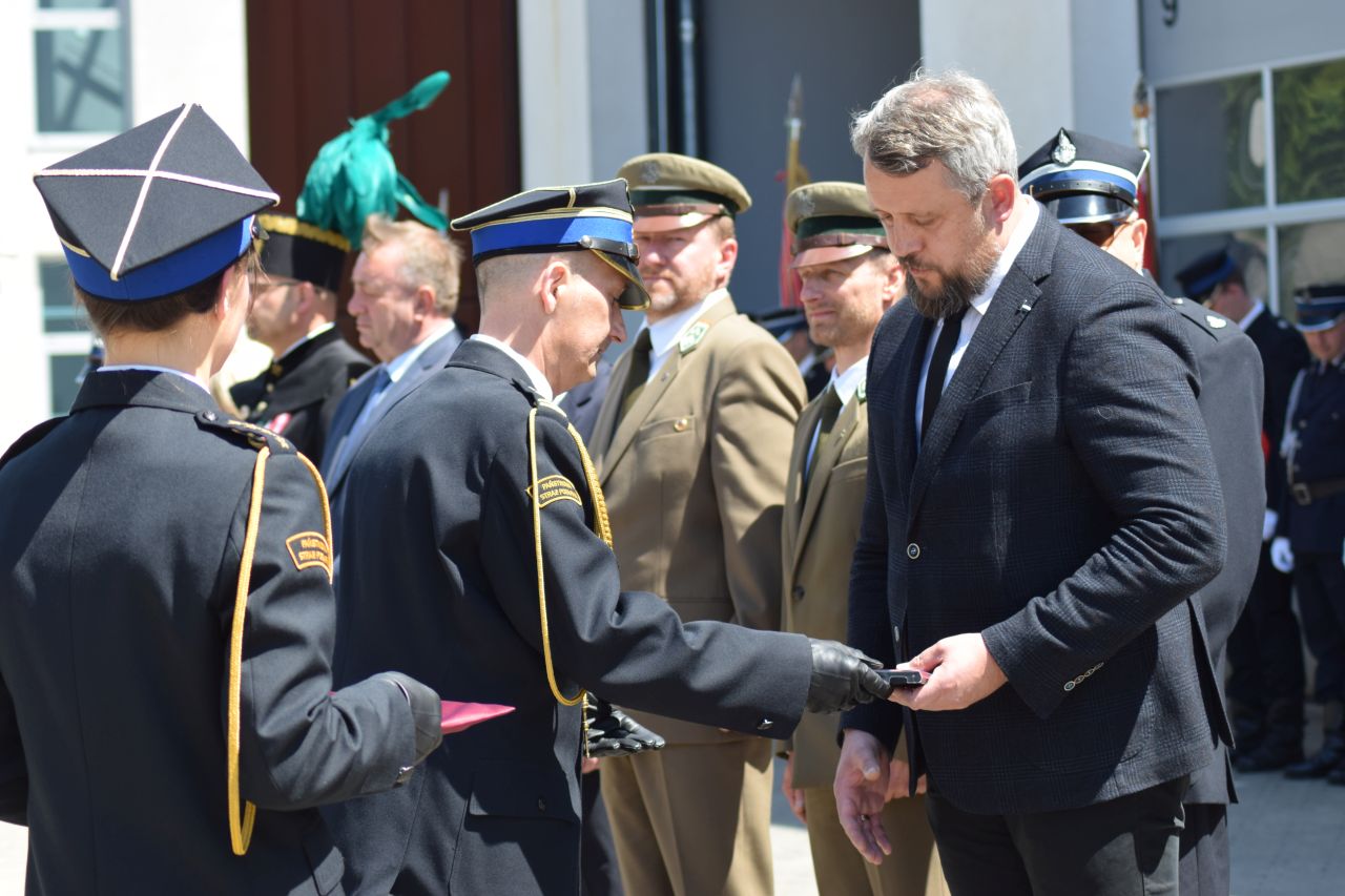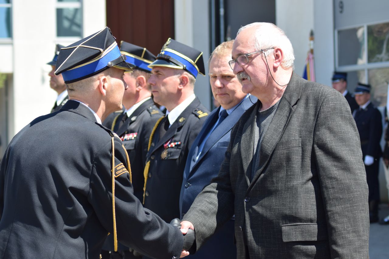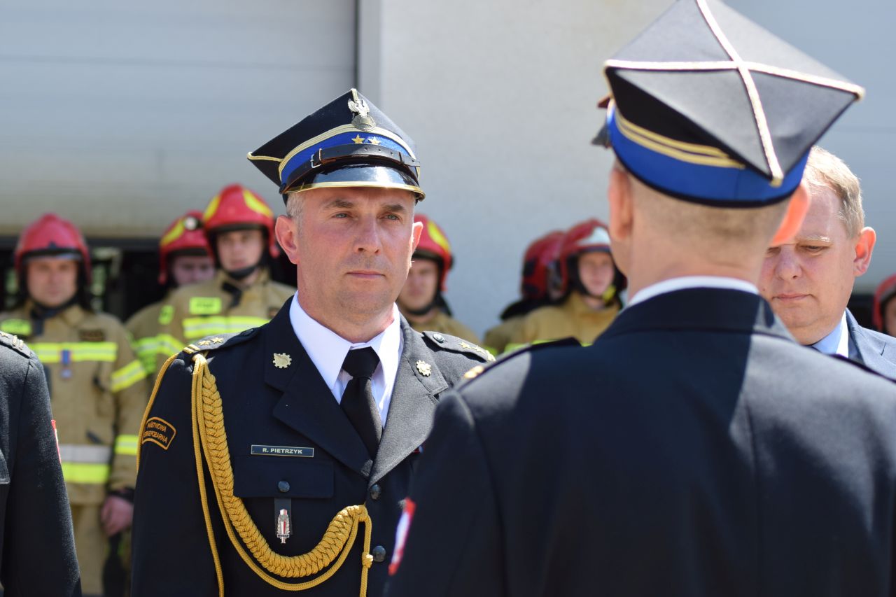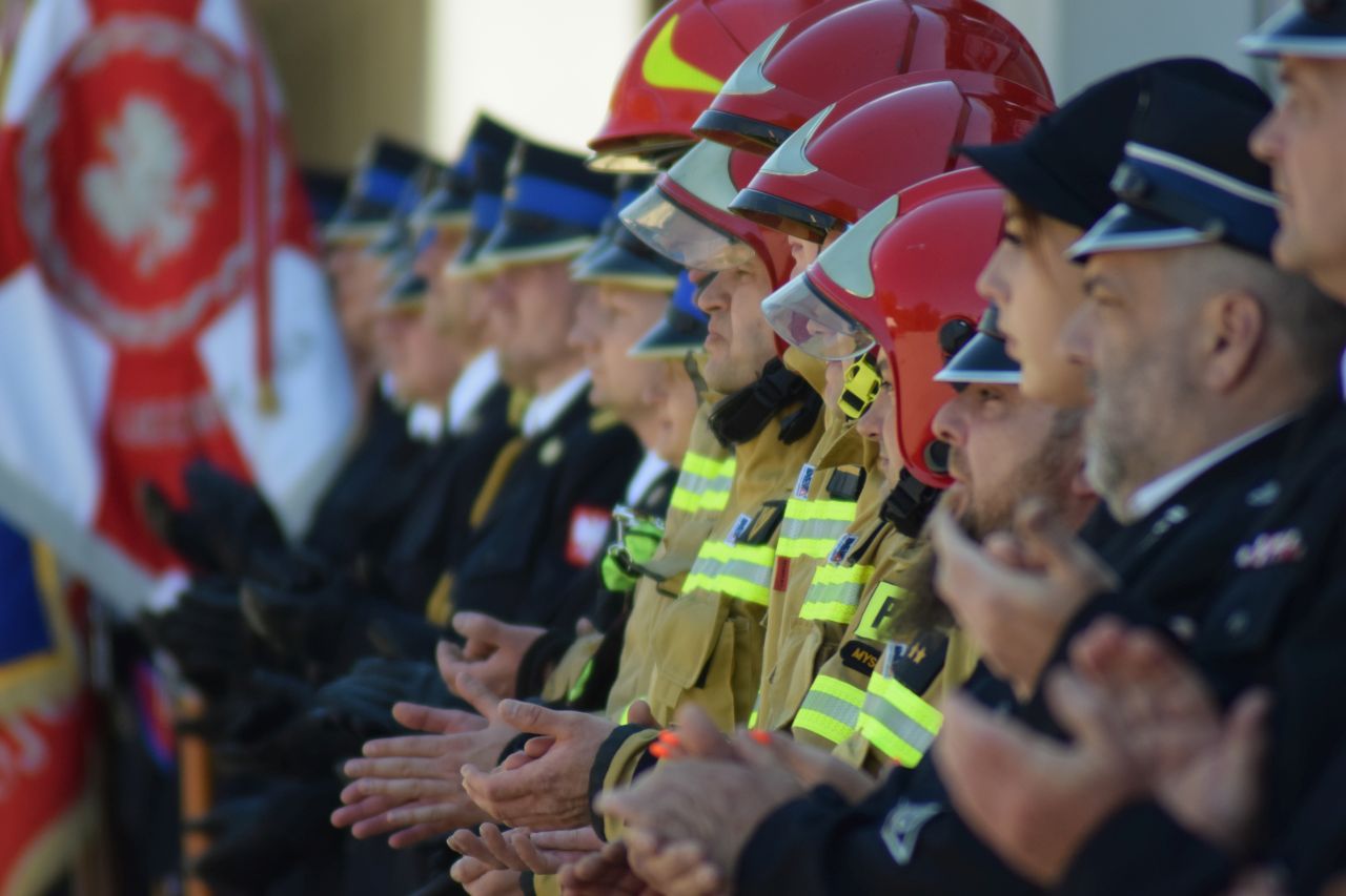 Uroczystość przed Komendą Miejską Państwowej Straży Pożarnej w Mysłowicach była okazją do wręczenia awansów na wyższe stopnie służbowe, odznaczeń i okolicznościowych medali z okazji 30-lecia PSP oraz prezydenckich nagród.