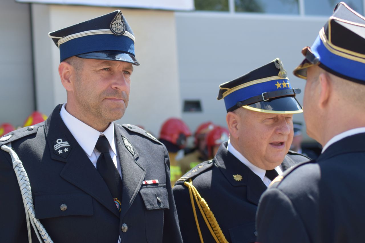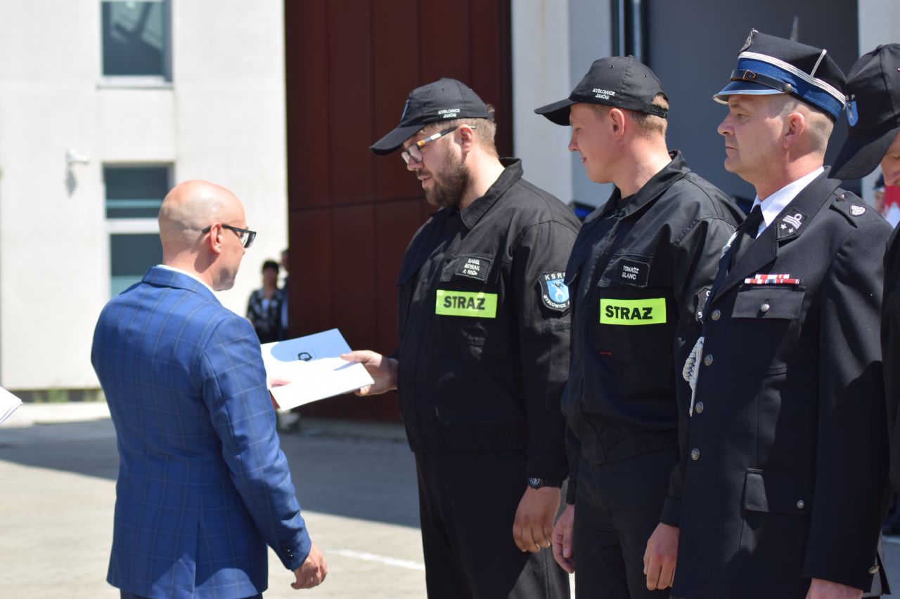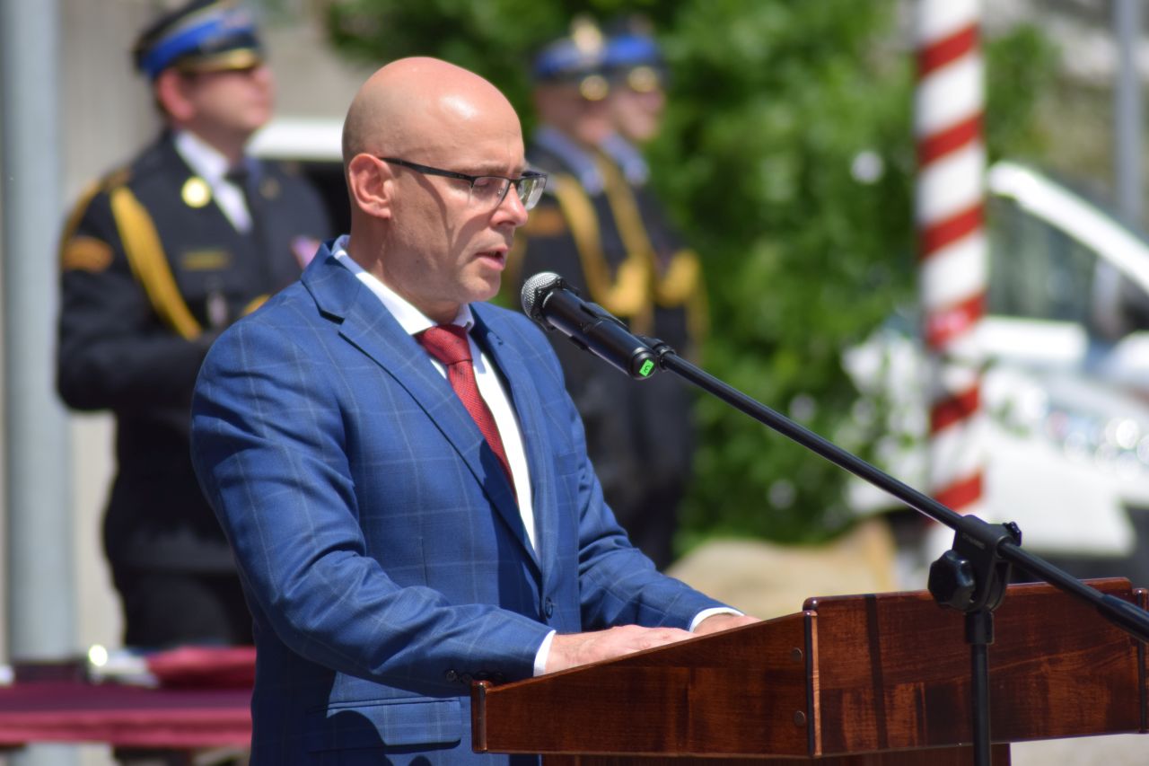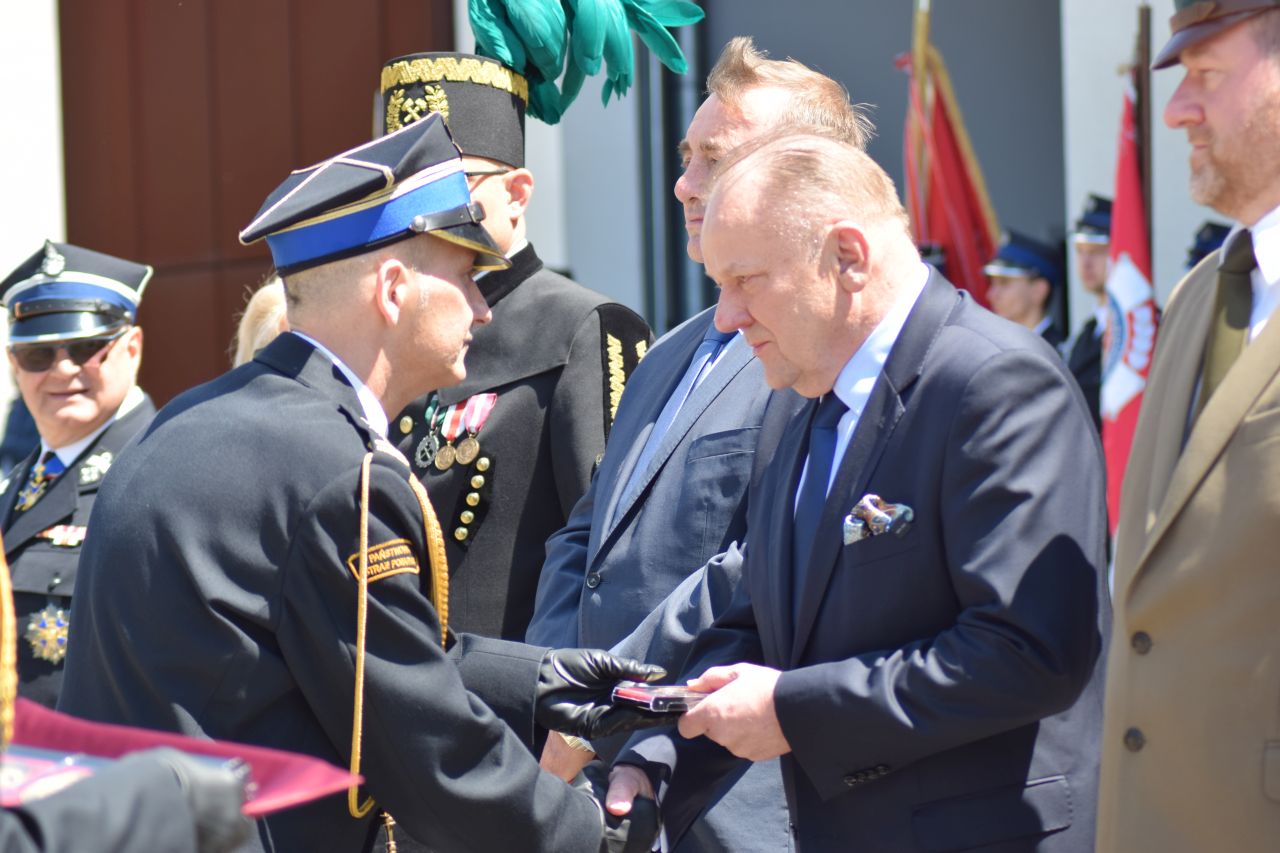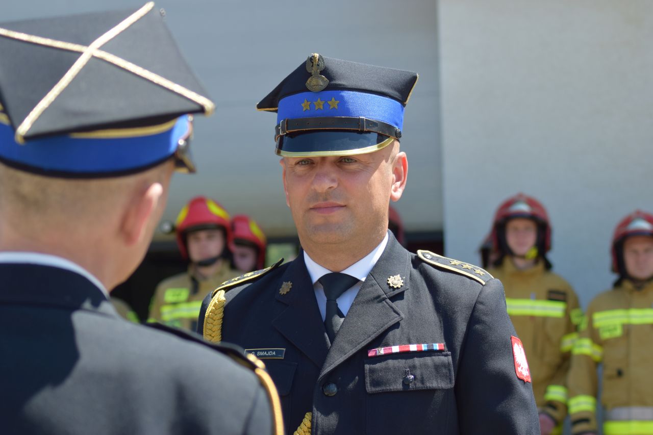 Uroczystość przed Komendą Miejską Państwowej Straży Pożarnej w Mysłowicach była okazją do wręczenia awansów na wyższe stopnie służbowe, odznaczeń i okolicznościowych medali z okazji 30-lecia PSP oraz prezydenckich nagród.