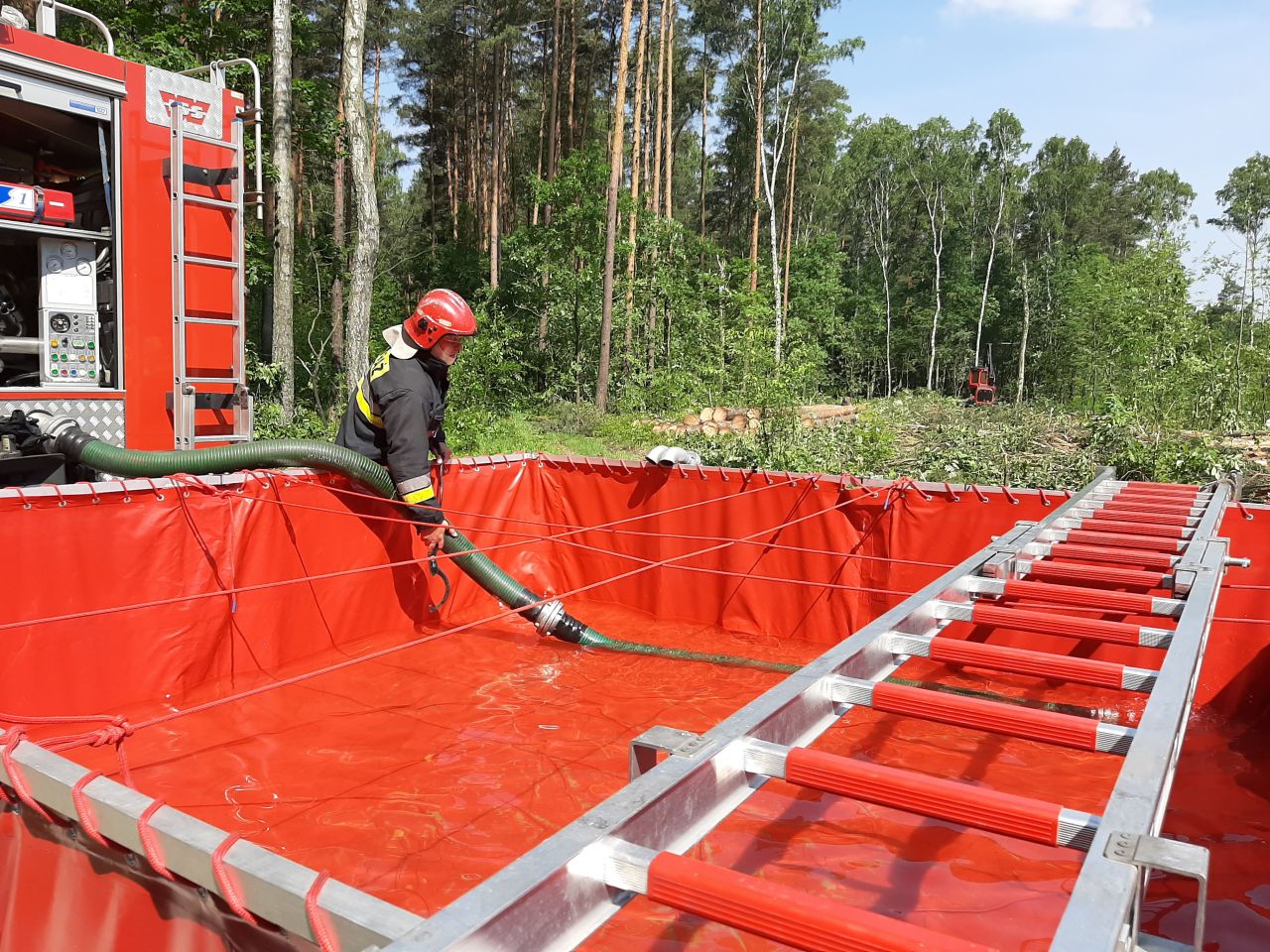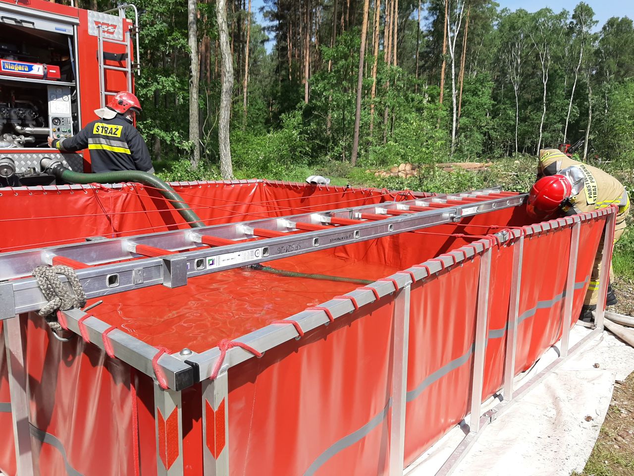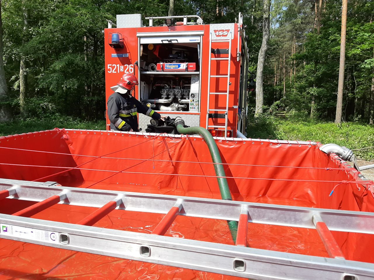 – W tym przypadku mamy ujęcie wody na głębokich rowach melioracyjnych, tam będzie zanurzona pompa ze specjalnym ssakiem i z tych rowów woda będzie transportowana wozami bojowymi i będzie też rozłożona linia, 450 metrów węży, będziemy tę wodę transportować do tego zbiornika i ze zbiornika, z basenu, później już w miejsce pożaru – opowiada Aleksander Zakrzewski.