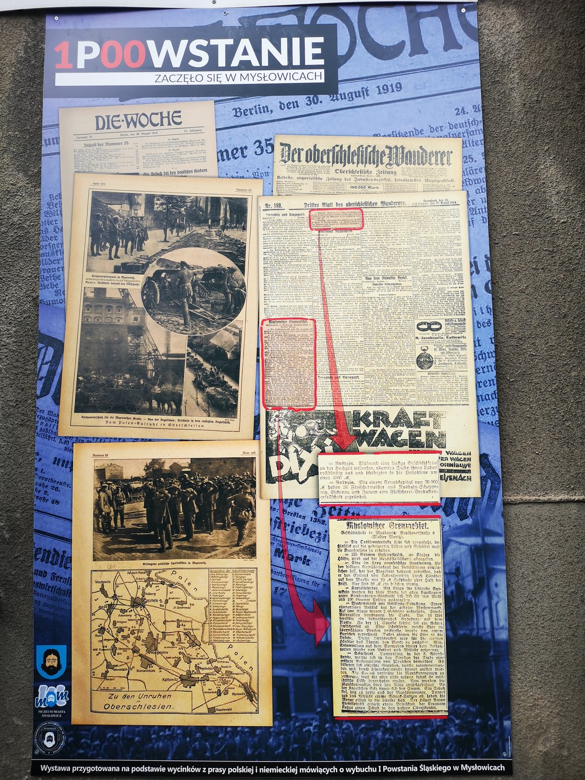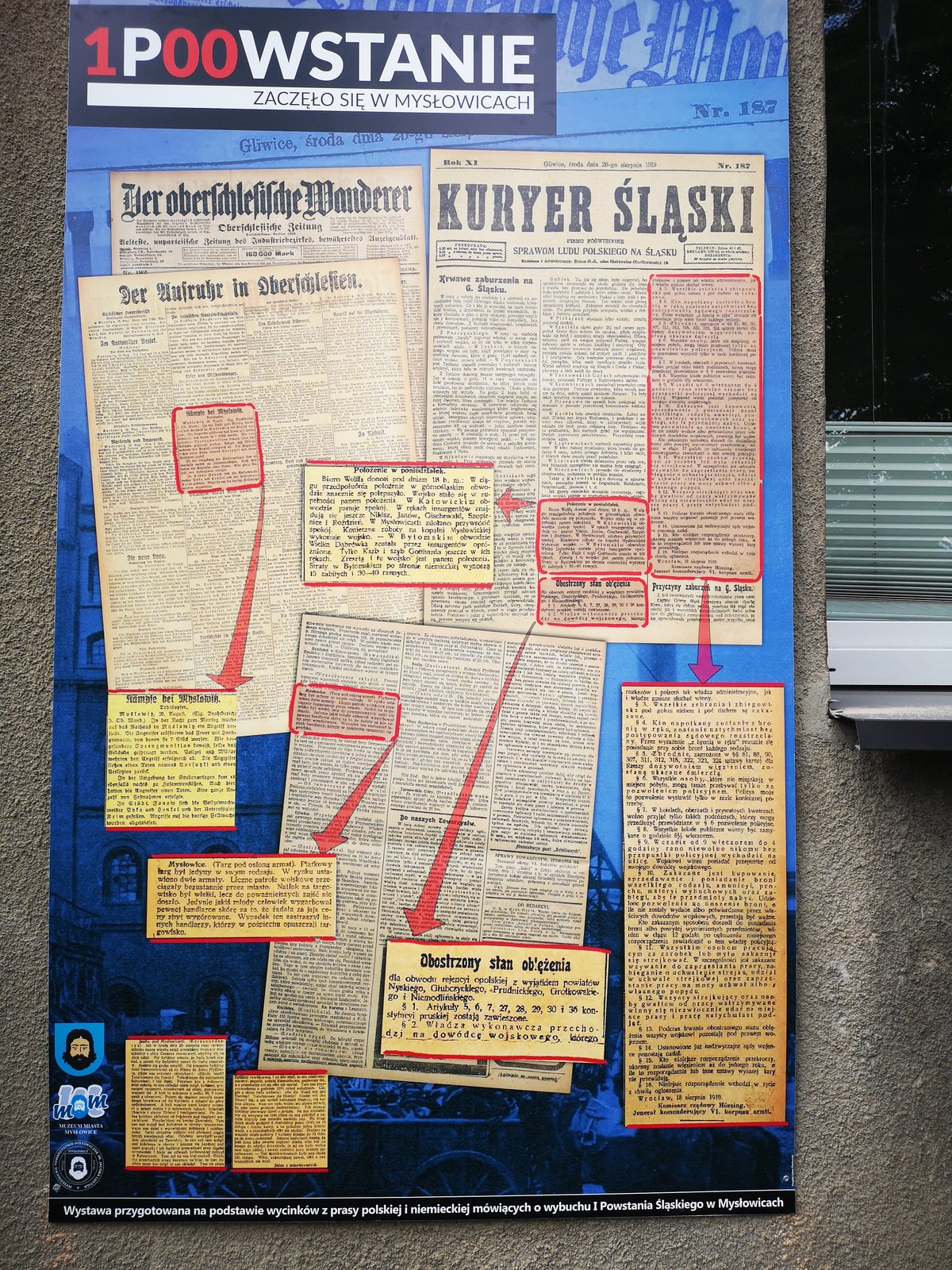 Każda plansza pokazuje informacje z jednego dnia powstania zarówno w gazetach polskich, jak i niemieckich. Co ważne, wiadomości te pokrywają się ze sobą. Wycinki z gazet zgromadziło Mysłowickie Towarzystwo Historyczne im. Jacoba Lustiga. Poszukiwało ich w Bibliotece Śląskiej, archiwach, a nawet w bibliotece słupskiej. Projekt i wykonanie plansz to zasługa dyrektora Muzeum Miasta Mysłowice Adama Plackowskiego. Całość sfinansował urząd miasta.
