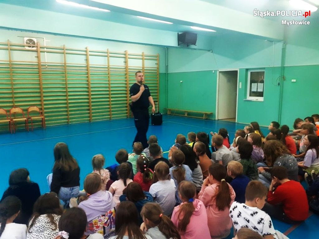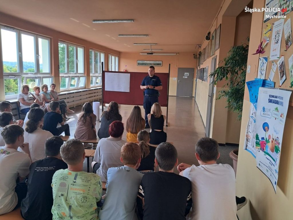 – Profilaktyk i dzielnicowi z mysłowickiej komendy przypominali najmłodszym o tym, jak należy zachowywać się w trakcie wakacyjnego wypoczynku zarówno nad wodą, jak i w górach czy w mieście. Mundurowi powtórzyli również zasady bezpiecznego korzystania z sieci, zasady obowiązujące w ruchu drogowym oraz jaką odpowiedzialność ponoszą uczniowie zgodnie z obowiązującymi przepisami prawa. Tradycyjnie nie zabrakło ciekawych pytań ze strony dzieci – na większość z nich policjanci udzielili odpowiedzi – relacjonuje mł. asp. Łukasz Paździora, oficer prasowy Komendy Miejskiej Policji w Mysłowicach.