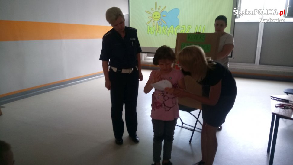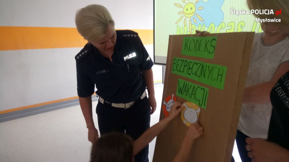 Treści teoretyczne uzupełniała przykładami niebezpiecznych zachowań dzieci i młodzieży, które zna z codziennej służby. Informacje te są ważne z uwagi na to, że w czasie wakacji młodzież mając dużo wolnego czasu nie zawsze spędza go w sposób konstruktywny. Następnie wspólnie z uczniami utworzyli „Kodeks bezpiecznych wakacji”. Na koniec spotkania policjantka życzyła dzieciom udanego, ale przede wszystkim bezpiecznego letniego wypoczynku.