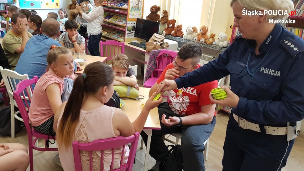 – Policjanci mysłowickiej komendy przeprowadzili kolejną prelekcję nt. bezpieczeństwa podczas trwających właśnie wakacji. Uczestnikami prelekcji, która odbyła się w filli nr 5 Miejskiej Biblioteki Publicznej były dzieci ze Stowarzyszenia Pomocy Dzieciom Niepełnosprawnym „Radość” w Mysłowicach oraz Świetlicy Młodzieżowej „U Świętej Faustyny”, działającej przy parafii Świętego Krzyża w Mysłowicach. Głównym tematem tych spotkań jest oczywiście bezpieczeństwo podczas letniego wypoczynku – informuje sierż Damian Sokołowski z KMP w Mysłowicach.
