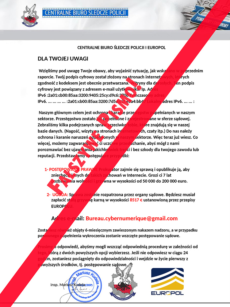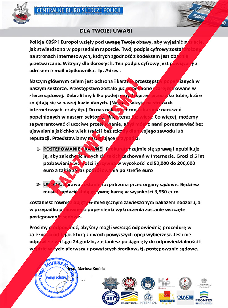 Celem uwiarygodnienia swojej wiadomości, oszuści załączają plik w formacie „PDF” rzekomo podpisany przez Komendanta Centralnego Biura Śledczego Policji, inspektora Cezarego Lubę lub inspektora Mariusza Kudelę – aktualnego Zastępcę Komendanta Wojewódzkiego Policji w Krakowie. Z jego treści wynika, że adresat jest podejrzany o dokonanie przestępstw o charakterze pornograficznym i jest zobowiązana do udzielenia odpowiedzi lub dokonania pewnej opłaty.