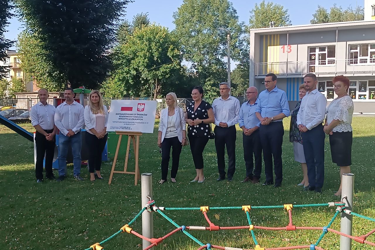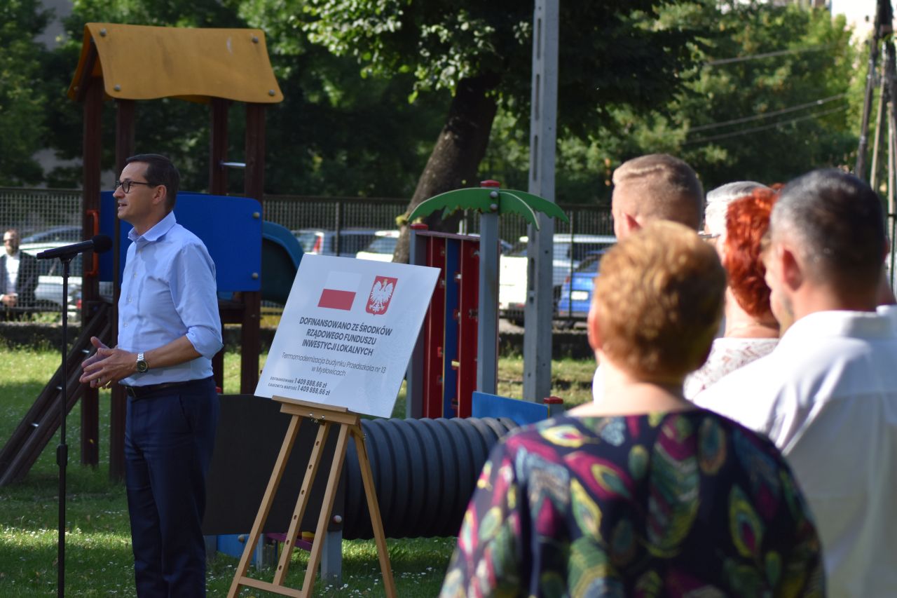 „Trzynastka” to jedno z trzech przedszkoli w naszym mieście, które w ubiegłym roku przeszły termomodernizację dzięki Rządowemu Funduszowi Inwestycji Lokalnych (więcej na ten temat tutaj). To właśnie tę placówkę odwiedził premier Morawiecki we wtorek 18 lipca po południu. Po przedszkolu oprowadziła go jego dyrektorka Barbara Ocieczek. Prezes Rady Ministrów spotkał się tu także m.in. z prezydentami Mysłowic, wojewodą śląskim i dziennikarzami.