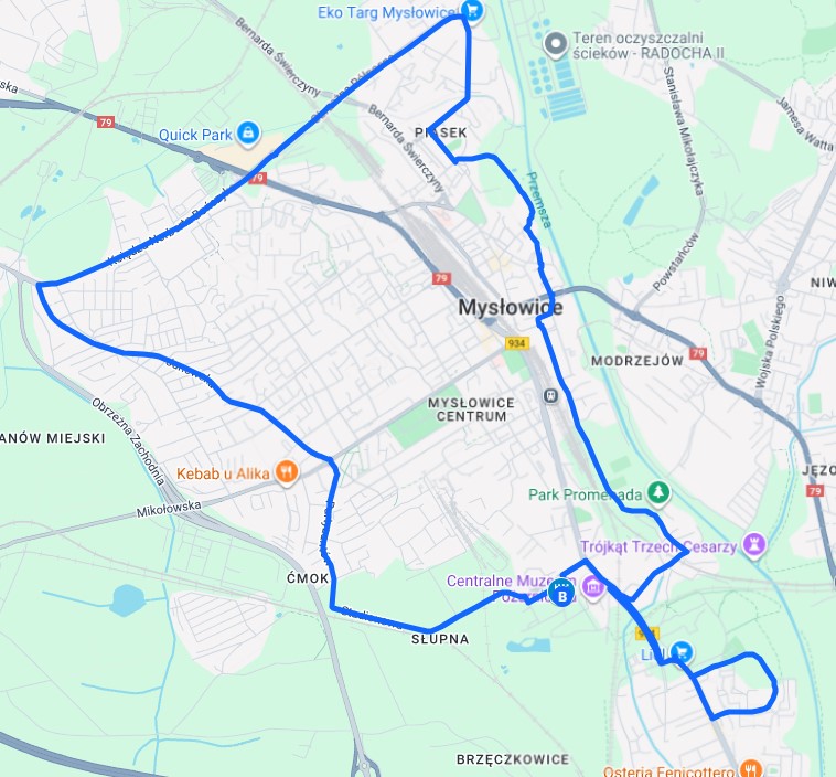 Start zaplanowano na godz. 20, na parkingu przy Parku Słupna. Trasa prowadzić będzie przez: Stadionową, Partyzantów, Janowską, Bończyka, Obrzeżną Północną, Sosnowiecką, Boliny, Gwarków, Stawową, alejki Parku Zamkowego, Kaczą, Strumieńskiego, Plac Wolności, Powstańców, alejki Parku Promenada, Portową, Oświęcimską, Ziętka, Hlonda, Ziętka i ponownie Oświęcimską. Zakończenie przejazdu przewidziano z kolei około godz. 22, ponownie w Parku Słupna.