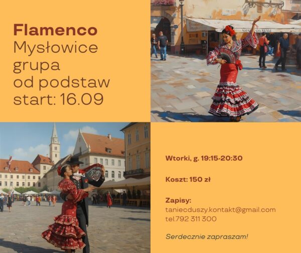 Od 16 września w każdy wtorek w godzinach 19.15-20.30 w Mysłowickim Ośrodku Kultury przy ul. Grunwaldzkiej 7 rusza nowa grupa flamenco dla początkujących. Zajęcia przeznaczone są dla osób szukających aktywności ruchowej, która angażuje zarówno ciało, jak i umysł, a także rozwija koncentrację oraz kreatywność. Koszt udziału wynosi 150 zł za cztery spotkania.