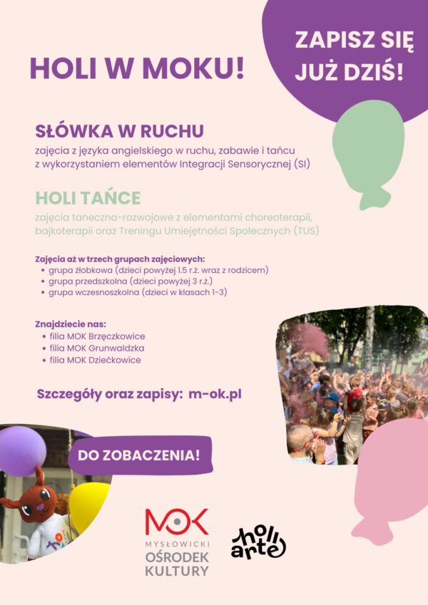 Od 15 września wystartują także warsztaty Holiarte w filii MOK-u w Brzęczkowicach, przy ul. Grunwaldzkiej i w Dziećkowicach. W ramach oferty dostępne będą zajęcia „Słówka w ruchu”, czyli innowacyjne zajęcia z języka angielskiego łączące edukację z ruchem, zabawą i elementami integracji sensorycznej, a także „Holi tańce”, czyli zajęcia taneczno- rozwojowe, łączące ruch, rytm i ekspresję twórczą, działając ku wspieraniu emocji, budowaniu relacji i wzmacnianiu własnej wartości.