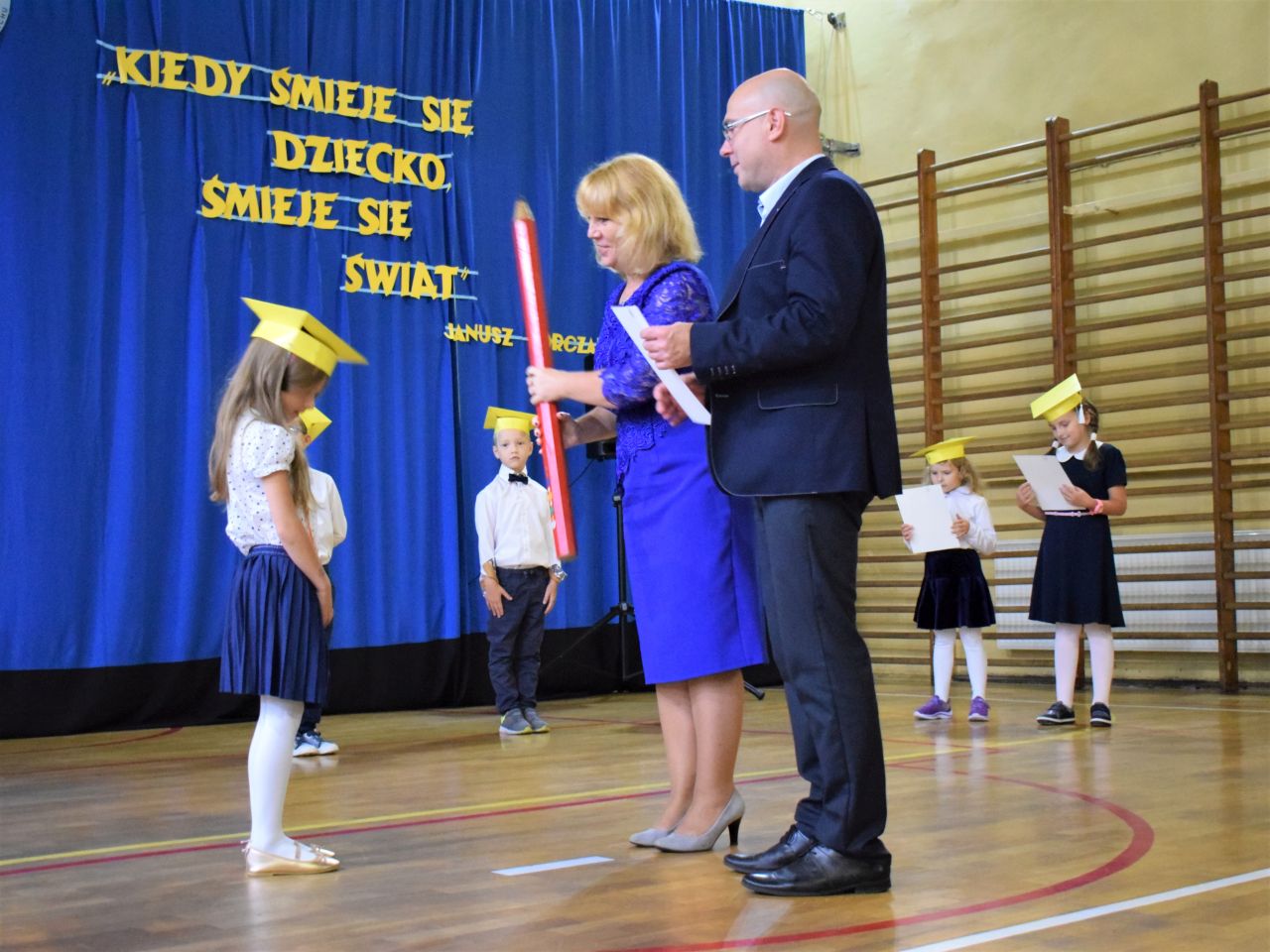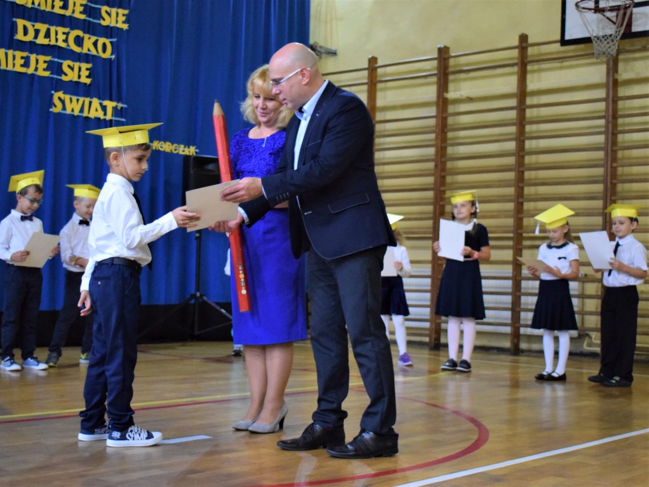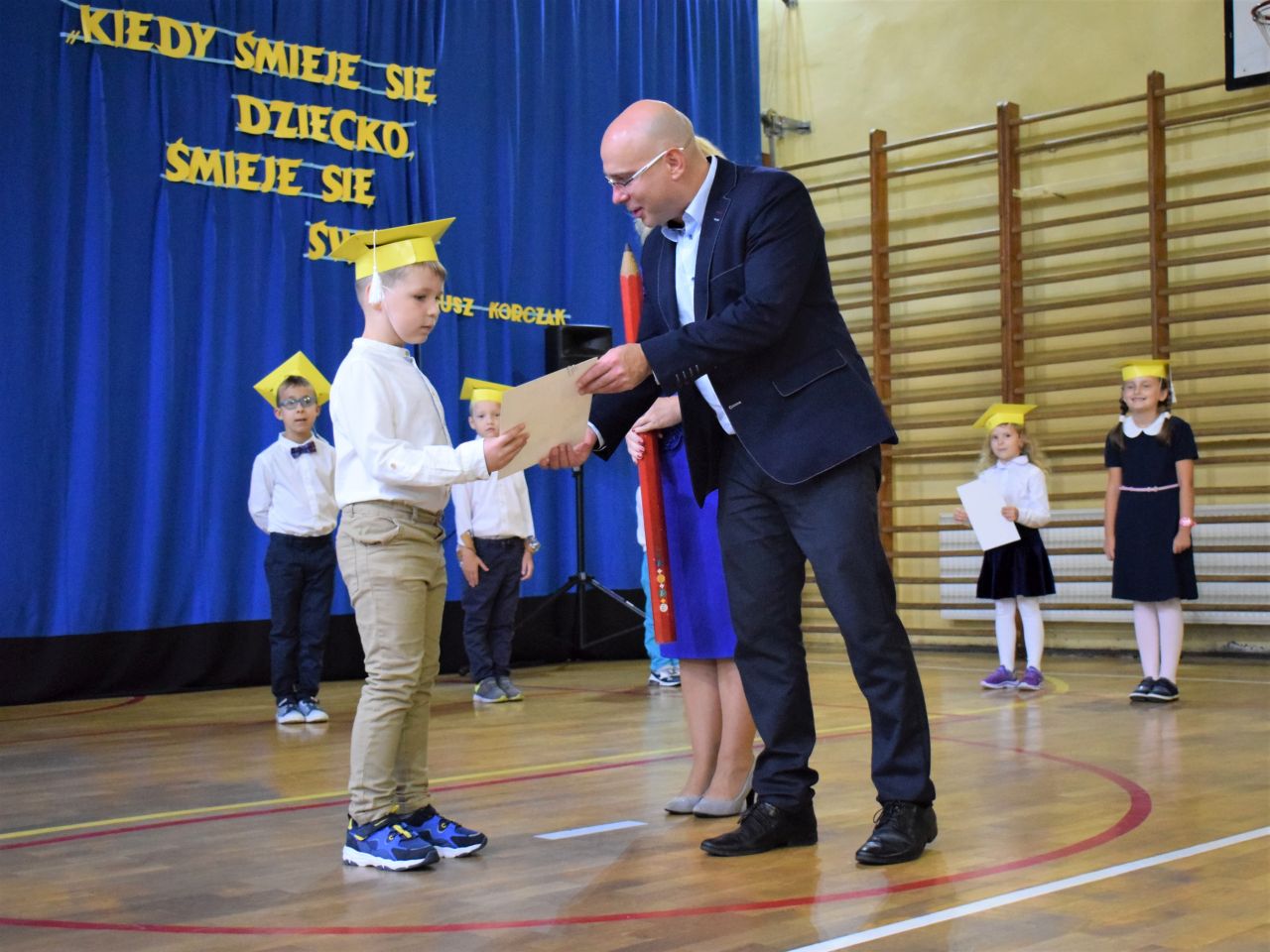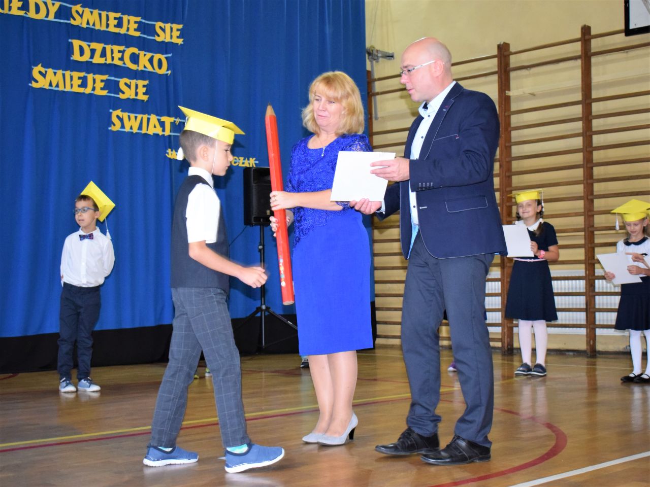 Zanim najmłodsi zostali przyjęci do grona społeczności szkolnej, zaprezentowali krótki program artystyczny, który zawierał zarówno wierszyki, jak i piosenki. Jednak najważniejszym momentem było ślubowanie, które wzbudziło wiele emocji. Aktu pasowania przy pomocy ogromnego ołówka dokonała dyrektor Barbara Zawiślak, a dyplomy wraz z pierwszymi szkolnymi legitymacjami wręczył prezydent Dariusz Wójtowicz.