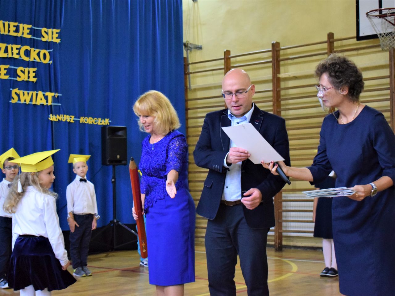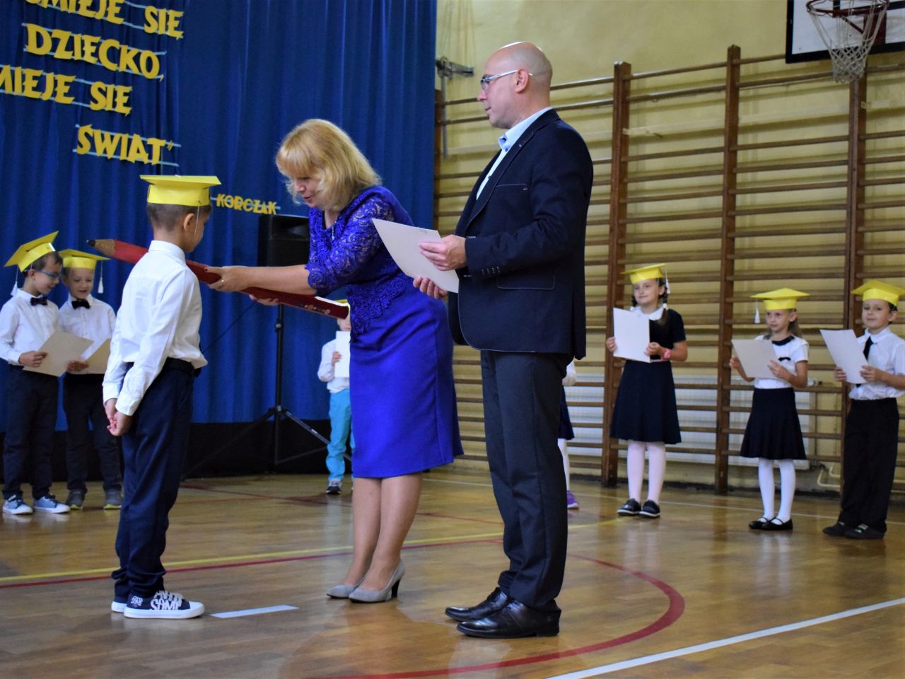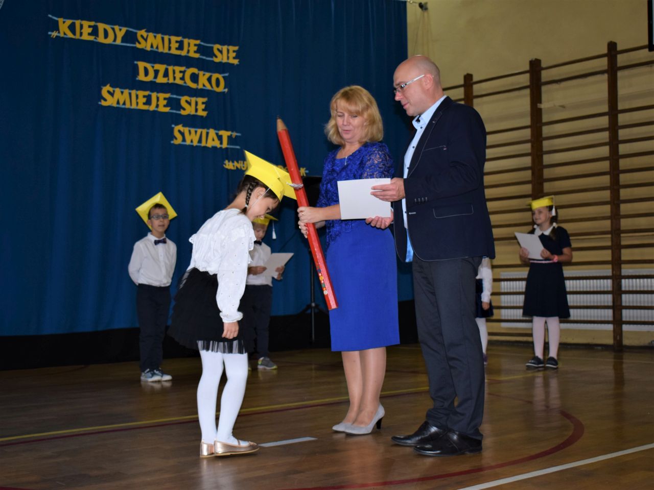 Zanim najmłodsi zostali przyjęci do grona społeczności szkolnej, zaprezentowali krótki program artystyczny, który zawierał zarówno wierszyki, jak i piosenki. Jednak najważniejszym momentem było ślubowanie, które wzbudziło wiele emocji. Aktu pasowania przy pomocy ogromnego ołówka dokonała dyrektor Barbara Zawiślak, a dyplomy wraz z pierwszymi szkolnymi legitymacjami wręczył prezydent Dariusz Wójtowicz.