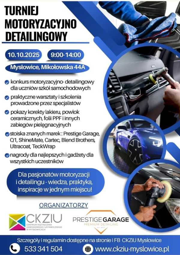 W programie znajdzie się także turniej motoryzacyjno–detailingowy dla uczniów szkół samochodowych, obejmujący trzy części: eliminacje w postaci testu wiedzy, quiz linia dla dziesięciu najlepszych uczestników z pierwszej rundy oraz trzeci opierający się na zadaniach praktycznych dla trzech osób z najwyższymi wynikami. Pomiędzy kolejnymi częściami konkursu prowadzone będą także warsztaty i szkolenia. Zgłoszenia do turnieju z dołączoną zgodą należy dokonać poprzez adres e-mail: turniej@ckziu-myslowice.pl w terminie do 3 października.