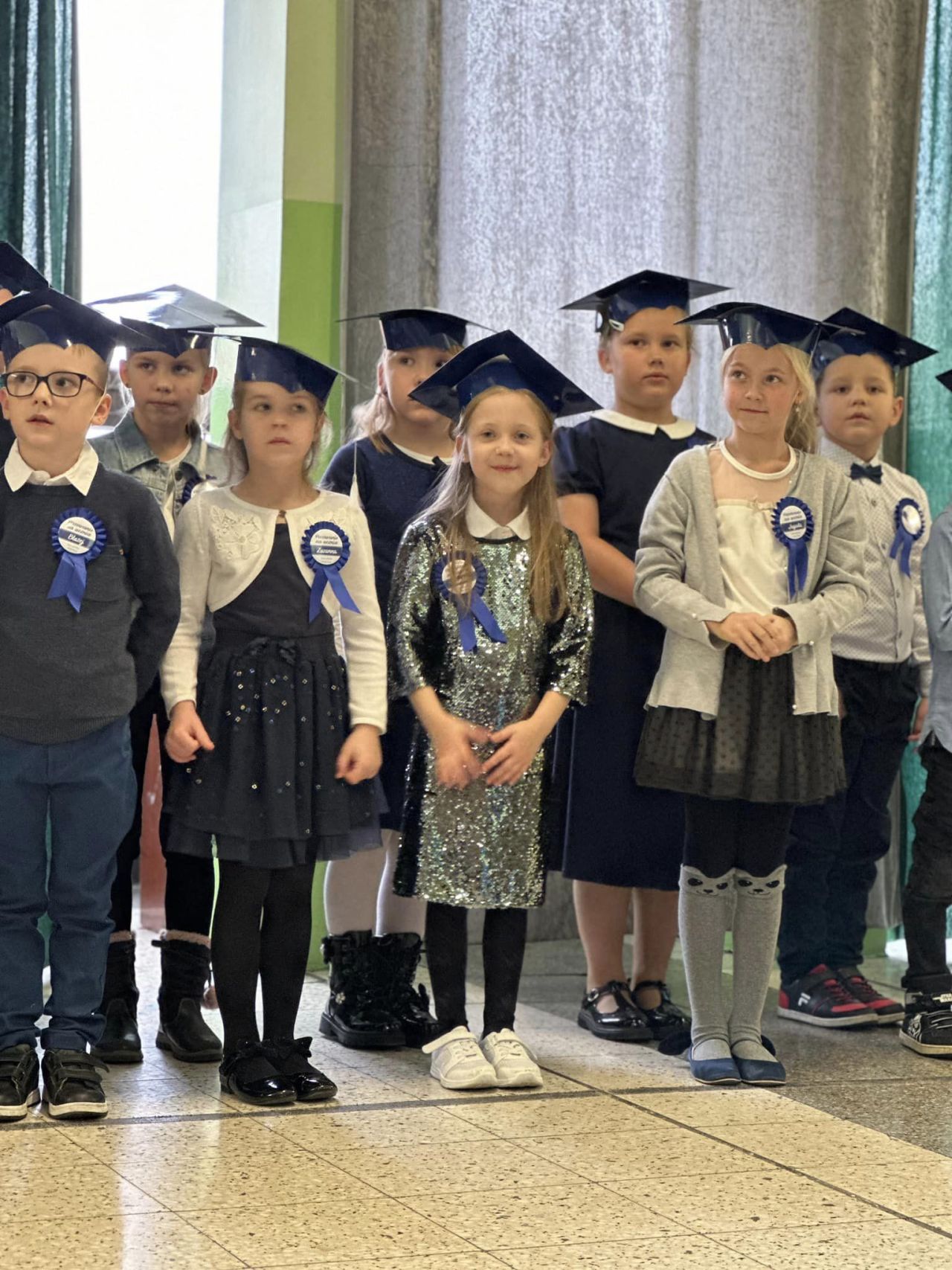 Po części artystycznej przystąpiono do najważniejszego w tym uroczystym dniu: aktu ślubowania. Uczniowie, w swoich galowych strojach, z pięknymi biało-granatowymi kotylionami i biretami na głowach, ślubowali: być dobrym i uczciwym, szanować rodziców i nauczycieli, uczyć się tego, co piękne i mądre oraz kochać i czcić swoją Ojczyznę. Aktu pasowania dokonał osobiście prezydent Dariusz Wójtowicz wraz z panią dyrektor Karoliną Kozioł-Mospinek. Pani dyrektor złożyła też gratulacje, dziękując przedstawicielom rady rodziców, rodzicom, dziadkom, bliskim za tak liczny udział w tak ważnej dla klas pierwszych uroczystości. Dzieci na swoim ramieniu poczuły niebieski ołówek. Pojawiły się zabawne pytania, czy aby nie był on zaczarowany, gdyż wszystko udało się niesamowicie.